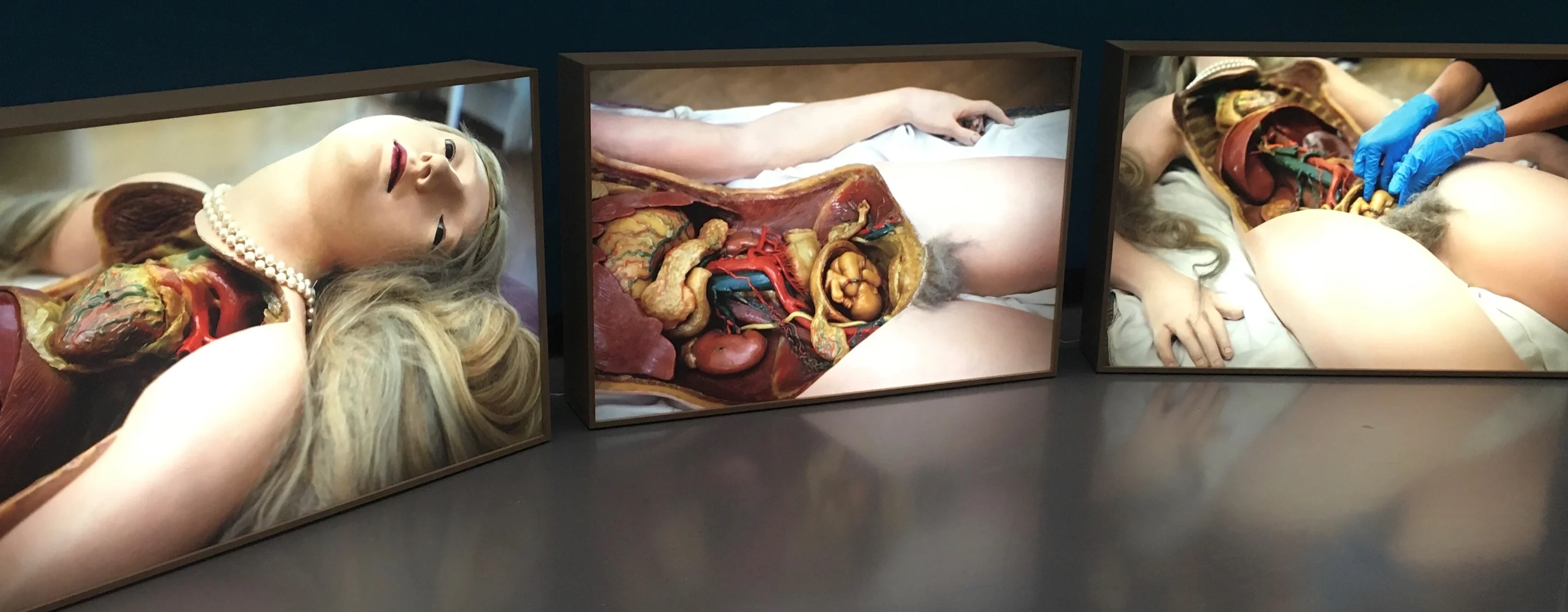 Auch die 1970 in St. Petersburg geborene, in Österreich lebende Video- und Installationskünstlerin Anna Jermolaewa überrascht mit der dreiteiligen Lichtboxen-Skulptur «Mediceische Venus» (Bild ganz oben): Sie zeigt aus drei verschiedenen Blickwinkeln ein berühmtes wächsernes Anatomiemodell einer Schwangeren aus dem Jahr 1785, die sich im Josephinum in Wien befindet. Auch da gibt es eine erstaunliche Überschneidung von medizinischem und künstlerischem Vorgehen: Auf einem Bild machen sich Hände in blauen Handschuhen im offenen Leib der Frau zu schaffen. Man denkt an Hände eines Chirurgen, doch in Wahrheit ist eine mit der Präzision des Chirurgen arbeitende Restauratorin am Werk.