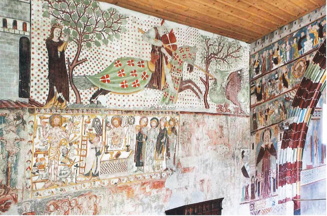 Da erscheint uns ein ganz anderer Drachenkämpfer: nicht wie sonst mit dem Pferd über dem Drachen stehend, der sich im Todeskampf windet und den letzten Stich erhält. Der Waltensburger Meister schildet den Beginn des Kampfes. Als christlich gerüsteter Ritter führt der heilige Georg auf Schild und Pferdedecke das vielfach sichtbare Kreuzzeichen. Wie bei einem Turnier galoppiert er mit einer Stosslanze auf seinen Gegner zu: Es ist ein furchteinflössendes Mischwesen mit Schlangenleib, Krallenfüssen und Flügeln. Die Königstochter erhebt die Hände zum Gebet. (4) Stilisierte Bäume verstärken das Dargestellte.