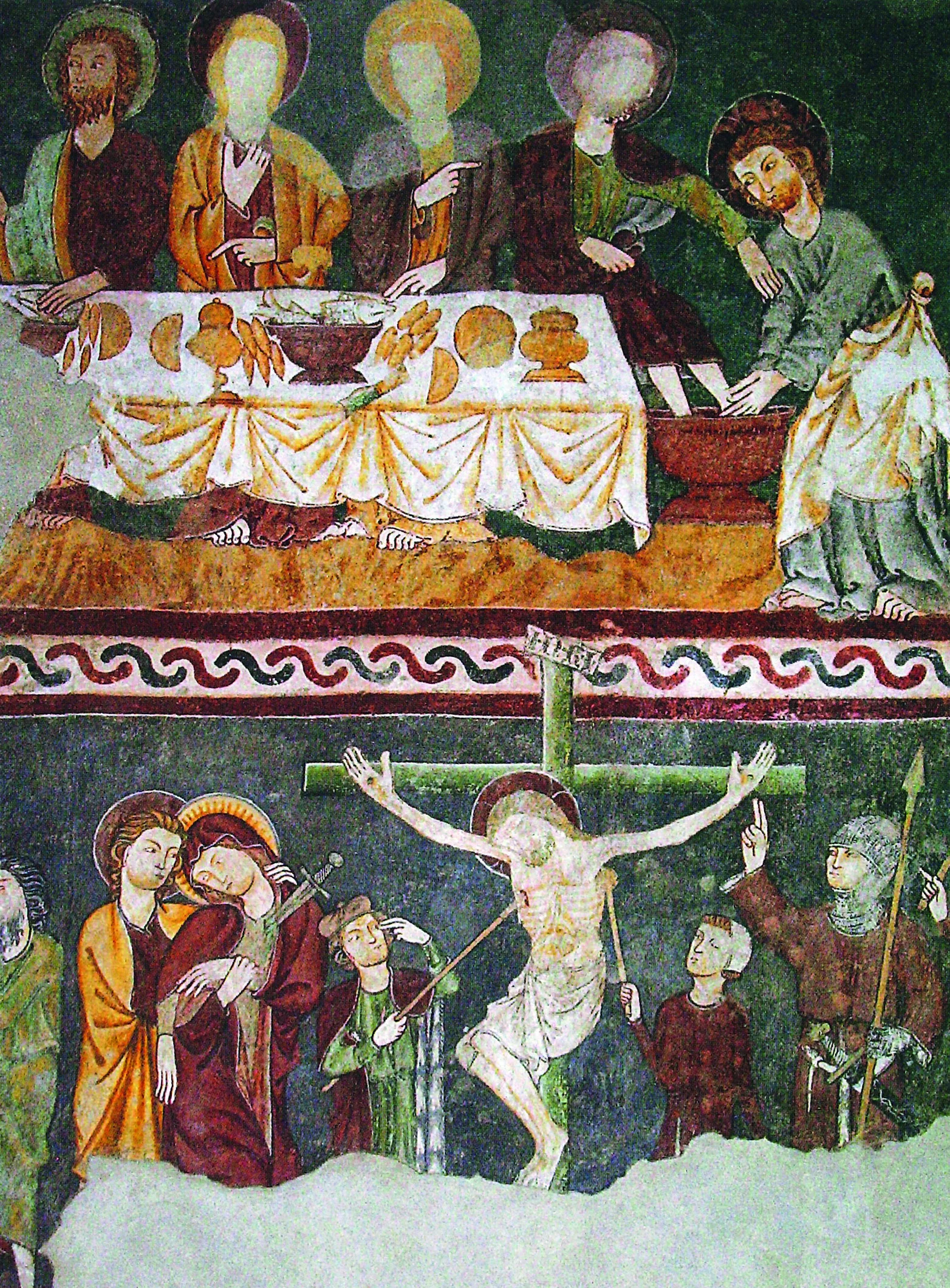 Ausgangspunkt dieser kunsthistorischen «Expeditionen» war die reformierte Kirche Waltensburg/Vuorz im Vorderrheintal. Hier, in dieser abgelegenen Gegend der Surselva, schuf der unbekannte Künstler um 1330 einen Passionszyklus – eine eindrucksvolle Figurendarstellung. In zwei übereinanderliegenden Reihen erzählt er die Leidensgeschichte Jesu. Die einzelnen Fresken gehen sachte ineinander über – vom Abendmahl über die Fusswaschung, den Judaskuss zur Gefangennahme und Dornenkrönung. Der Maler nimmt uns mit auf den Kreuzweg und lässt uns die Kreuzigung Christi nacherleben. (1)