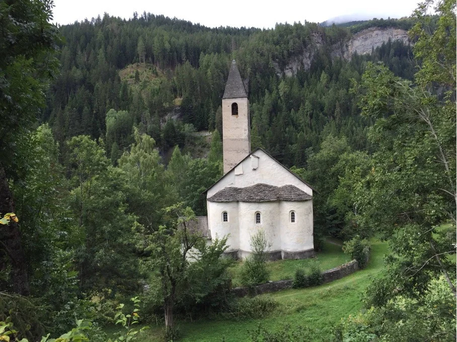 Der Kontrast könnte nicht grösser sein: Wenige Meter nach der vielbefahrenen, lauten Kantonsstrasse von Thusis nach Tiefencastel tauchen wir in eine wohltuende Stille. Schnell löst sich der Lärmbrei auf. Vom kleinen Hotel Mistail bei Alvaschein an dieser Julierroute führt ein schattiger Waldweg sanft hinunter auf eine Sonnterrasse über der Albulaschlucht. Plötzlich taucht vor uns das berühmte karolingische Dreiapsidenkirchlein auf; abgeschieden liegt es auf dem kleinen Felsplateau. Zu entdecken sind noch zwei kleine Bauernhöfe, beide von Pflanzen umrankt. Fast etwas Arkadisches kommt uns in dieser Waldeinsamkeit entgegen, vielleicht sogar etwas märchenhaft Verwunschenes.