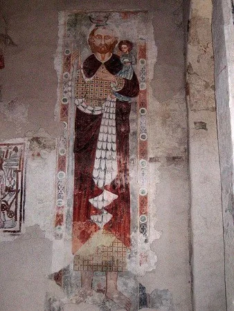 Wer vor dieser eindrücklichen Mittelapsis steht, dem leuchtet wohl als Erstes das Apostelfries entgegen. Von den zwölf Aposteln ist nur Petrus sicher zu erkennen. Der Stellvertreter Jesu Christi und Kirchenpatron von Mistail trägt als sein Attribut den Petrusschlüssel. Darüber in der Wölbung thront Christus in der Mandorla, umgeben von Engeln mit den Symbolen der vier Evangelisten.[3] Die Nordwand zeigt ein beliebtes Volksmotiv in frühen Gotteshäusern: Christophorus als Christusträger. Staunend steht man vor diesem eindrücklichen Bild: der riesige, sieben Meter grosse Mann und das unscheinbare kleine Kind Christus.