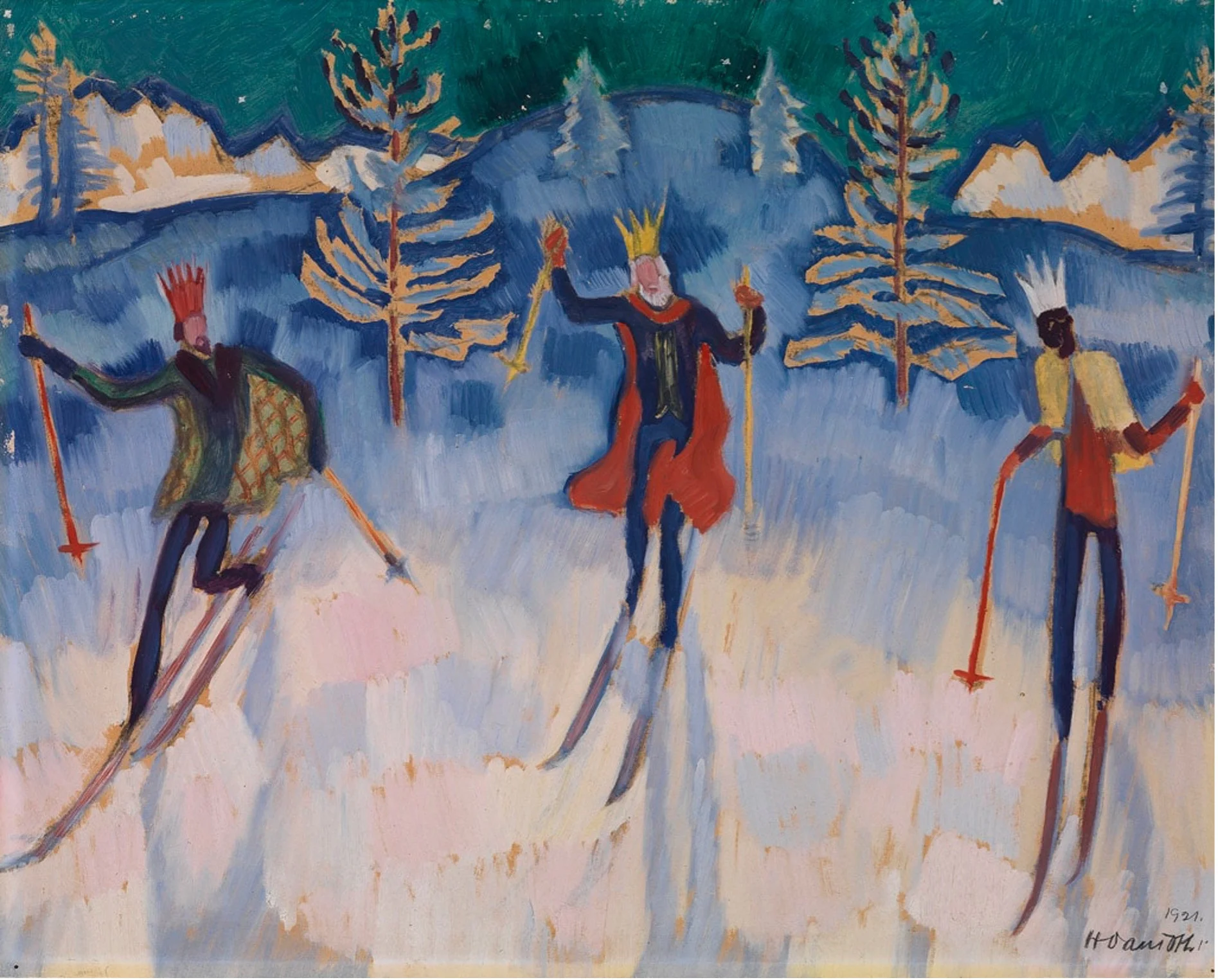 An ein Bild erinnere ich mich ganz besonders: Die Heiligen Drei Könige in Danioths eigener Lebenswelt. Auf Skiern fahren sie durch die Urner Berglandschaft.[1] Aus dem verschneiten Wald kommen sie einem im Schuss entgegen. Parallel und schwungvoll. Der dunkle Nachthimmel mit wenigen Sternen kontrastiert zu den weissen Bergen. Das gibt dem Bild die Tiefe.