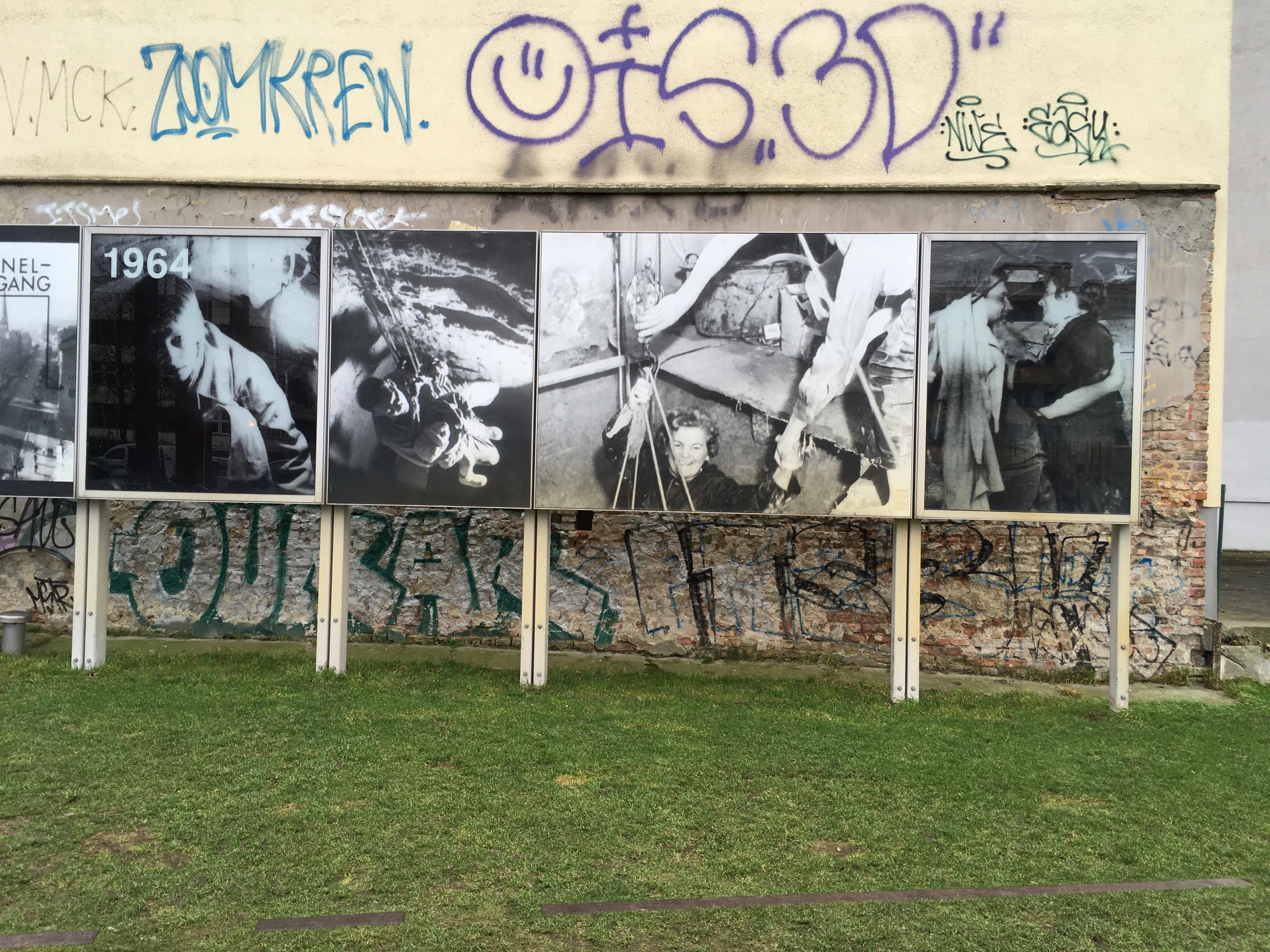 Unser Ziel, zwei Stationen entfernt, ist die Bernauer Strasse, heute ein Erinnerungsort. Ein breiter Streifen erinnert an die Mauer, von der noch ein Stück erhalten geblieben ist und deren Geschichte die Gedenkstätte Berliner Mauer erzählt. Grosse Fotos zeigen, was hier geschah; in den Boden eingelassen sind zwei Platten mit den Beschriftungen «Tunnel 29» und «Tunnel 57». Mehr als siebzig Versuche hat es gegeben, die Mauer unterirdisch zu überwinden. Neunzehn davon waren erfolgreich, nur drei von Osten her.