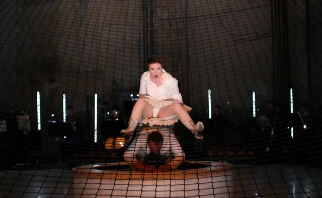 Jemand kommt die Treppe herunter und schmettert eine Barockarie. Von den Leitern und dem Turm wird auch gesungen, gesprochen, werden Texte zitiert. Zuschauer werden Darsteller und dann wieder Zuschauer. Geräuschkompositionen werden hörbar, die wechselnden Bilder auf den Leinwänden und Monitoren buhlen um Aufmerksamkeit, und das Publikum ist dazu noch eingeladen dies alles aus verschiedenen Blickwinkeln zu betrachten. Eine Fülle von Eindrücken.