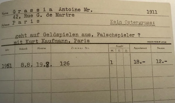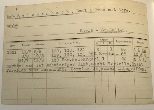 Das sind zwei der rund 20’000 Karten der Kartei, in welcher der Chef de Réception und der Concierge des Hauses ihre Erkenntnisse über die Gäste festzuhalten pflegten. Die ersten stammen von 1921, die letzten aus den frühen 1960er Jahren. Als das Grandhotel 1989 vollständig abbrannte, gelang es dem Besitzer und letzten Direktor Zollinger, den Schatz zu bergen.