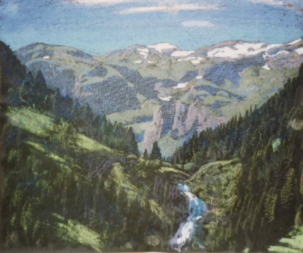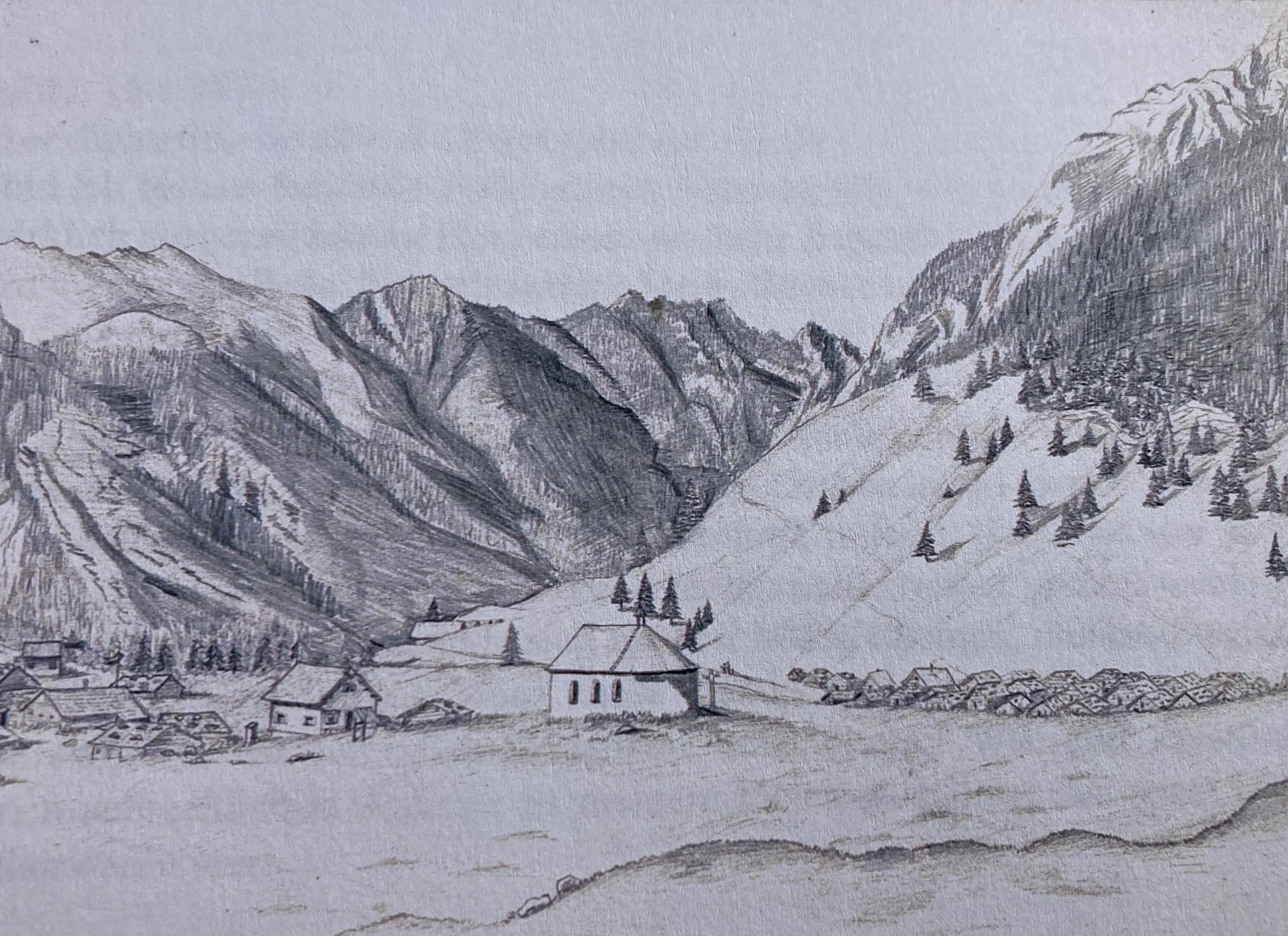 Im Nachlass meiner Eltern fanden sich einige Werke von Hedwig Scherrer, darunter zwei von ihr verfasste, bebilderte und von Hand geschriebene Märchenbücher für meinen Vater, deren Originale sich heute in der Kantonsbibliothek Vadiana in St. Gallen befinden (2). Doch weit mehr als diese Bücher hatten mich als Kind die Erzählungen meiner Grossmutter Frida über das geheimnisvolle Jagdhaus im Nenzinger Himmel fasziniert. Meine Fantasie wurde zusätzlich durch Hedwig Scherrers wunderbare Landschaftsbilder angeregt, welche in meinem Elternhaus hingen: Ein himmlisches Tal, das nur erreicht, wer die Mühsal eines langen Marsches auf sich nimmt, wo das Böse keinen Platz hat und wo sogar Jäger und Wild einen heiligen Pakt geschlossen zu haben scheinen. – Schliesslich war Joseph Scherrer ein Friedensaktivist gewesen.