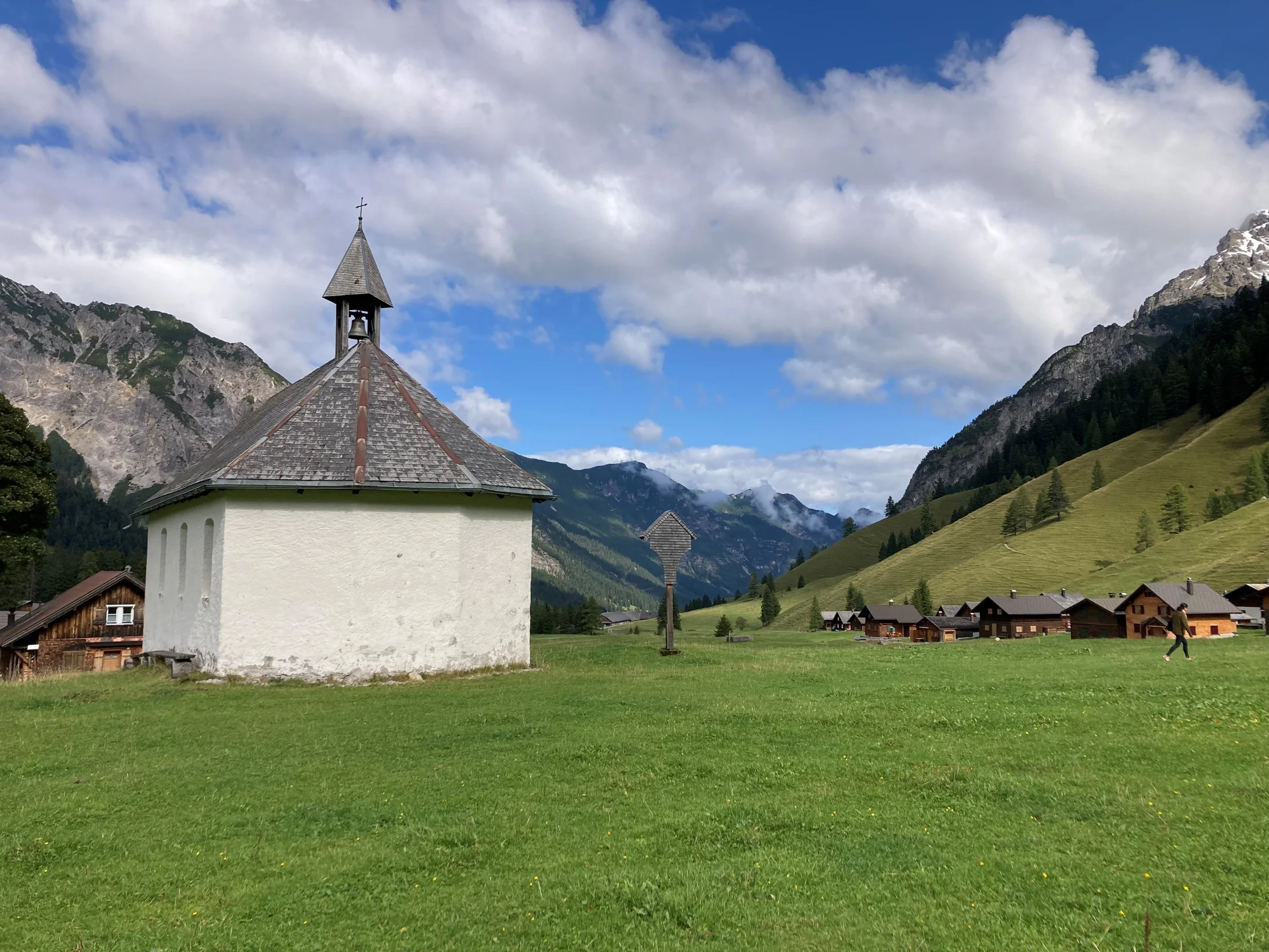 Über die Alpwiese gehen wir die wenigen Schritte zur Wallfahrtskapelle. Im Osten ragt – frisch verschneit – der Panüeler Kopf (2859 m) in den Himmel, im Süden, hinter dem Stüber Fall, die Felsen des Naafkopfs. Die durch die zwei Seitentäler gebildete Geländemulde des Nenzinger Himmels hat wahrscheinlich dem Gamperdonatal den Namen gegeben: Campus Rotundus, rundes Feld, woraus Gamperdond entstand, eine ältere Bezeichnung für das Tal. Die Kapelle ist dem heiligen Rochus gewidmet, dem Beschützer vor der Pest. Der Name lässt vermuten, dass das abgeschiedene Tal immer wieder Menschen Zuflucht gewesen war, welche sich vor der Pest schützen wollten – wie schon jene in Boccaccios Decamerone verewigten jungen Menschen, welche 1348 von der Pest in Florenz Reissaus genommen hatten.