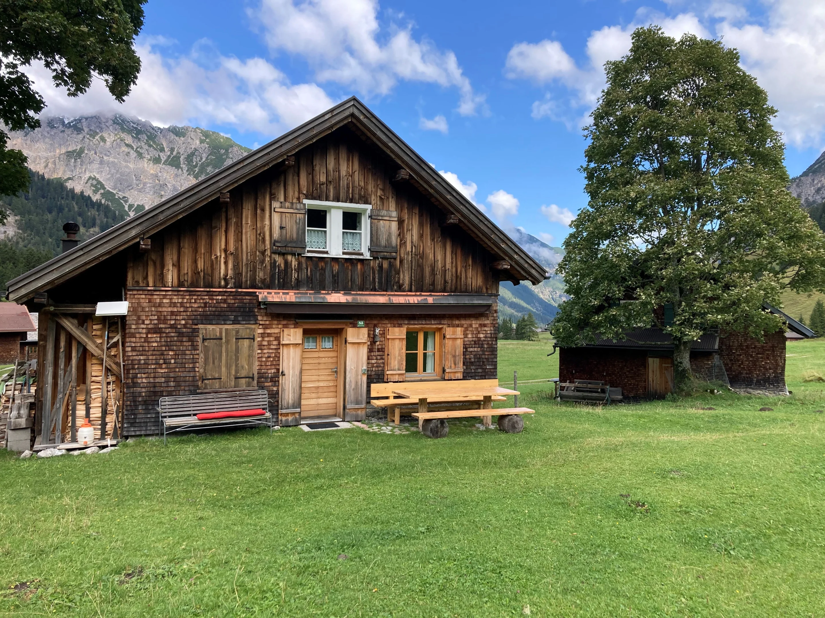 Ankunft des roten Busses vor dem Alpengasthof (1370 m ü. M.). Wir wandern als erstes zur Häusergruppe nördlich der Wallfahrtskapelle St. Rochus. Dort steht das berühmte Jagdhaus, in dem Hedwig und Frida vor mehr als 120 Jahren weibliche Unabhängigkeit zelebriert hatten. Eigentlich hatte ich mir die Hütte romantischer und einsamer vorgestellt, nahe am «finsteren Wald» – soviel über die Entthronung der Träume durch die Wirklichkeit! Die Jagdhütte ist von Joseph Scherrer aus einer ehemaligen Alphütte umgebaut worden und immer schon Teil einer kleinen Häusergruppe gewesen.