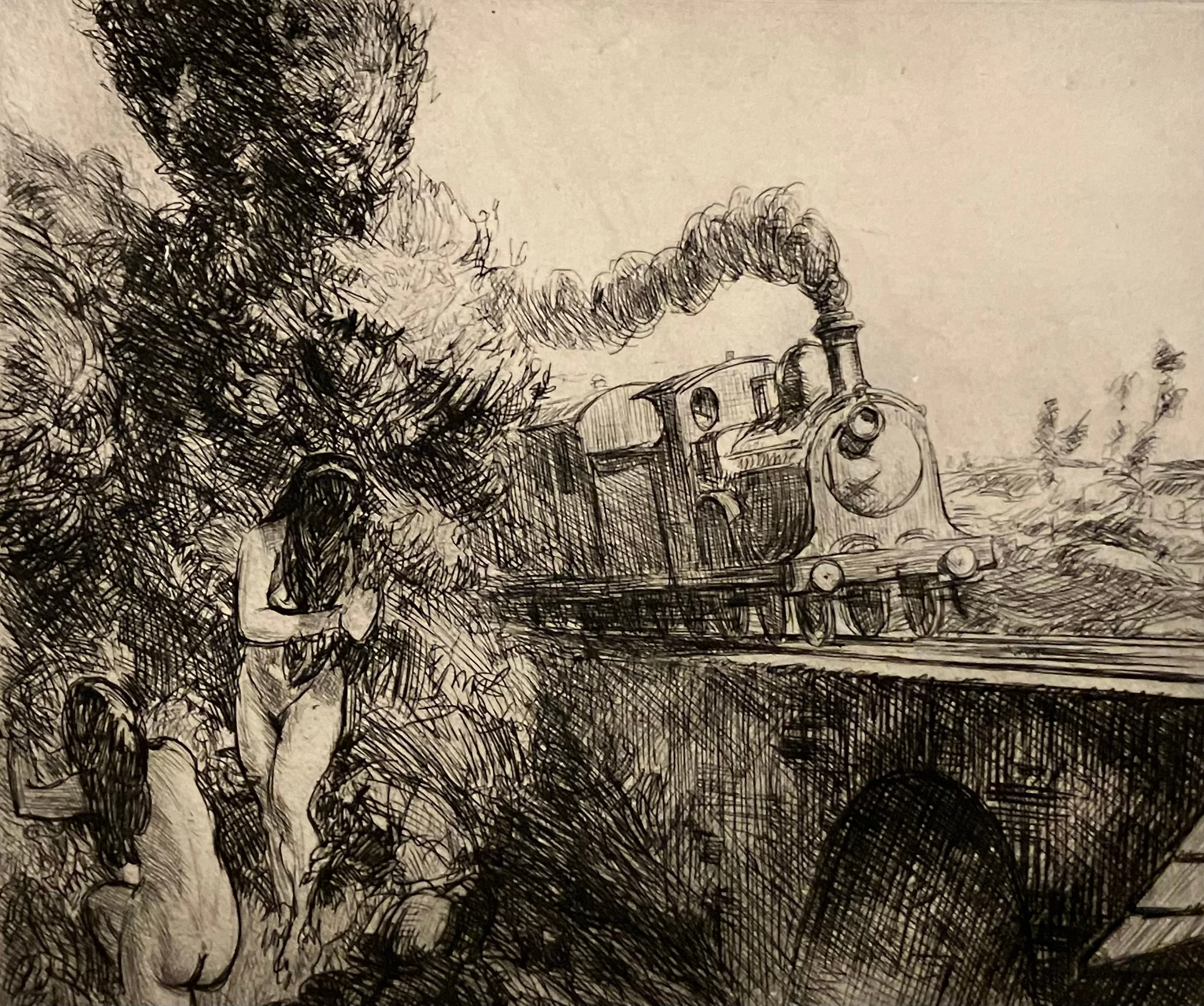 Auf Hoppers Grafik bedroht die qualmende Lokomotive das frohe Naturerlebnis zweier Badender. Die Ausstellung belegt auch, wie der Geschwindigkeitsrausch des Eisenbahnzeitalters die Futuristen beflügelte.