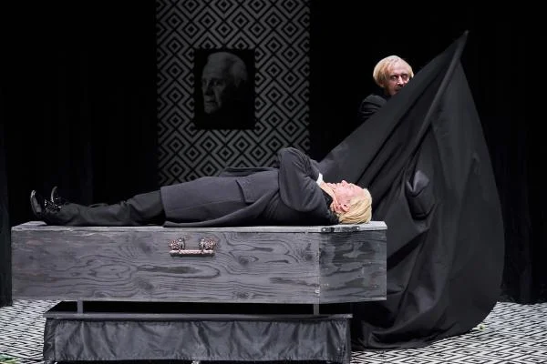 Fesseln ja. Aber da ist nicht nur Lachen. Wenn die beiden Söhne am Sarge ihres Übervaters Odysseus im nüchternen, gekachelten Raum eines heutigen Bestattungsunternehmens erstmals in ihrem Leben aufeinandertreffen und in einem unglaublichen Sprachenmix miteinander diskutieren, ist da erst mal natürlich auch Rivalität und Fremdheit, die in Aggression umschlägt. Denn beide wussten voneinander ja – laut antikem homerischen Epos – gar nichts.