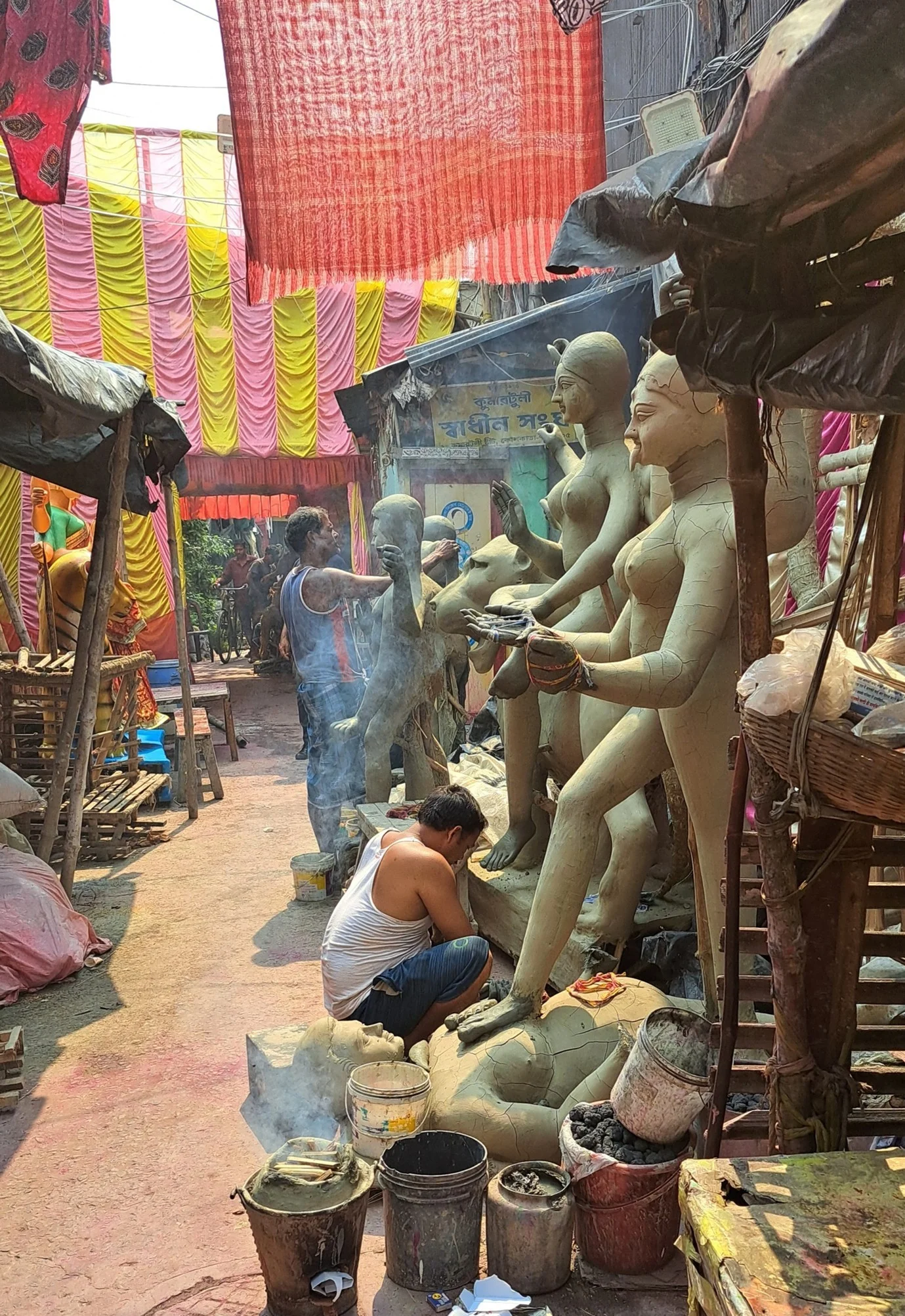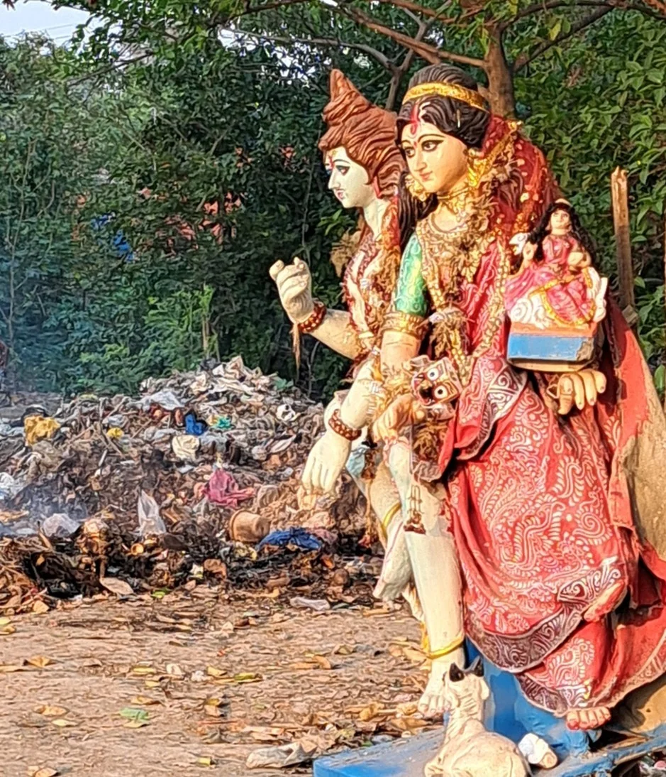 Aber da die Behörden den Hooghly nicht unnötig verschmutzten wollen, muss es beim kurzen Eintauchen bleiben. Aus dem Wasser gezogen waren die Angebeteten nur noch Abfall; oder das Geflecht landete wieder in Kumartali, zwecks Reinkarnation im nächsten Fest.