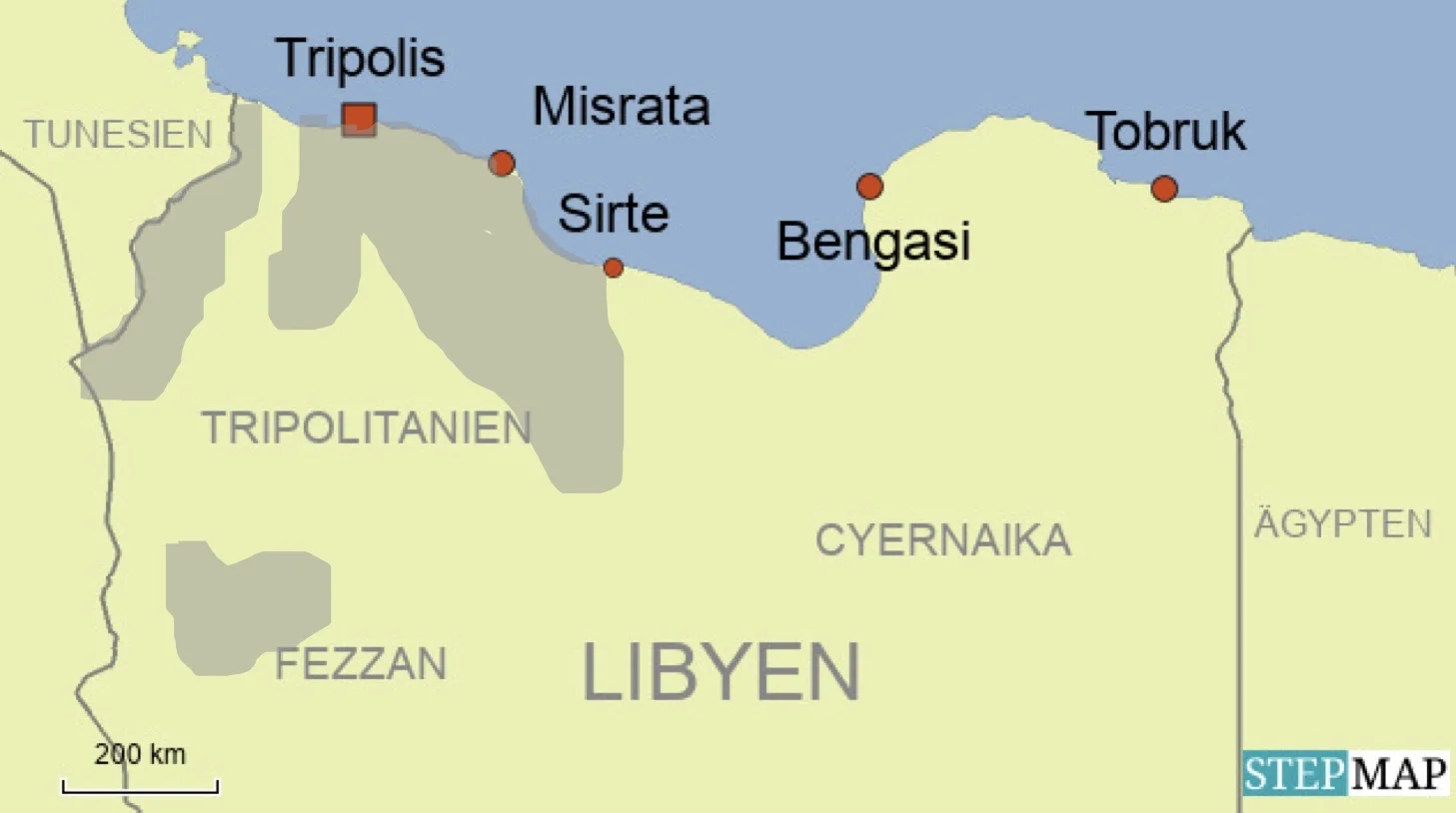 - Im Westen des Landes, in der Hauptstadt Tripolis und ihrer Umgebung, dominiert die international anerkannte Regierung von Präsidend Fayiz as-Sarraj (sprich: Sarradsch). Er wird von der Uno, Katar, der früheren Kolonialmacht Italien und neuerdings auch von der Türkei unterstützt.