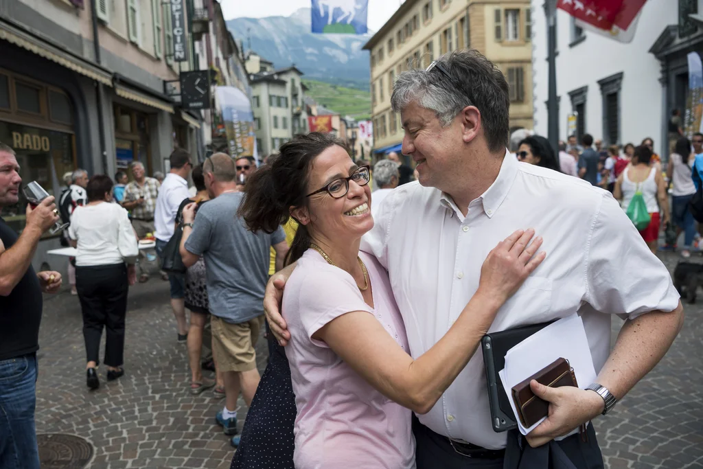 Freude bei den Gegnern der Olympischen Winterspiele 2026 in Sion. Marie-Teheres Sangra (WWF Wallis) und Jean-Pascal Fournier, Präsident der Grünen des Kantons Wallis, umarmen sich.