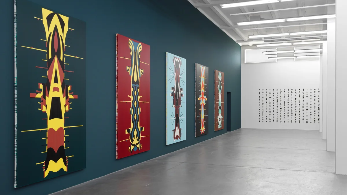 Das ist beim Deutschen Timo Nasseri (*1972) völlig anders. Wir finden ihn im Säulensaal auf dem dritten Stock. Seine grossformatigen Malereien sind so kontrolliert und streng wie nur möglich. Sie zeigen an Totems oder afrikanische Muster gemahnende, an der senkrechten Mittelachse gespiegelte Kompositionen aus geometrischen Flächen, die monochrom gestaltet oder mit regelmässigen Farbverläufen versehen sind. Angeblich lehnen sie sich an Tarnbemalungen, sogenannte Razzle-Dazzle-Muster an, die im Ersten Weltkrieg von der Marine verwendet wurden, um Position und Kurs von Booten zu verschleiern.
