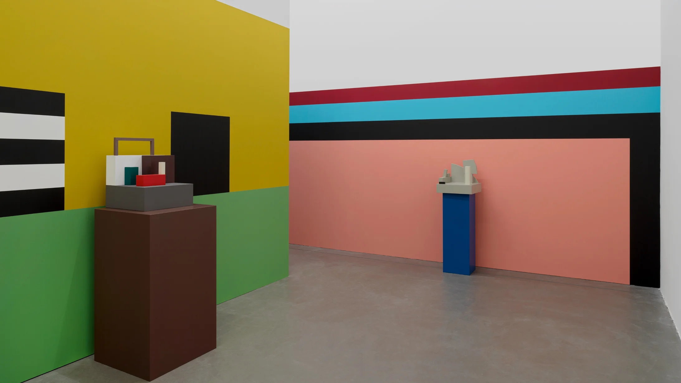 Im kleineren Saal gleich gegenüber hat Nathalie Du Pasquier (*1957) ein heiteres Gesamtkunstwerk aus Malerei, Skulptur und Raumgestaltung eingerichtet. Die Wände sind mit grosszügigen Farbflächen und -bändern bedeckt, auf farbigen Sockeln, am Boden und an Wänden befinden sich Kleinskulpturen aus bemaltem Holz, die teils an Architekturmodelle, teils an Puppenstuben erinnern. Man taucht ein in eine naiv-harmonische Welt der Poesie, die nur leicht irritiert ist durch das Surreale ihrer Objekte.