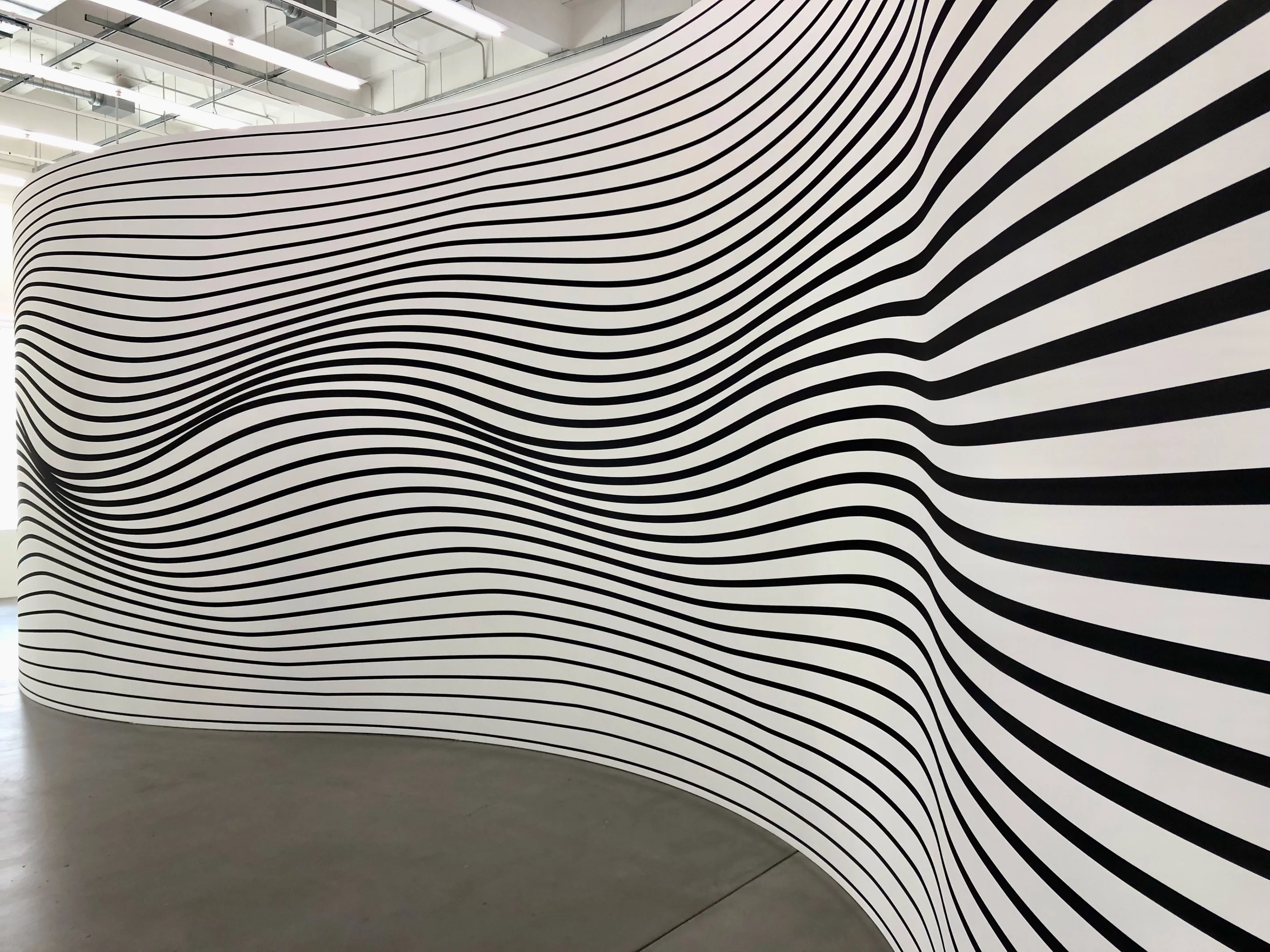 Betritt man den Saal im Erdgeschoss, so befällt einen gleich ein leichter Schwindel. Man steht dicht vor einer vier Meter hohen gekurvten Wand, die in einer Schlangenlinie den ganzen Raum einnimmt. Die mächtige architektonische Skulptur ist beidseits mit Wellenlinien bedeckt, die durch ihre Interferenzen die Wahrnehmung ins Schwimmen bringen.