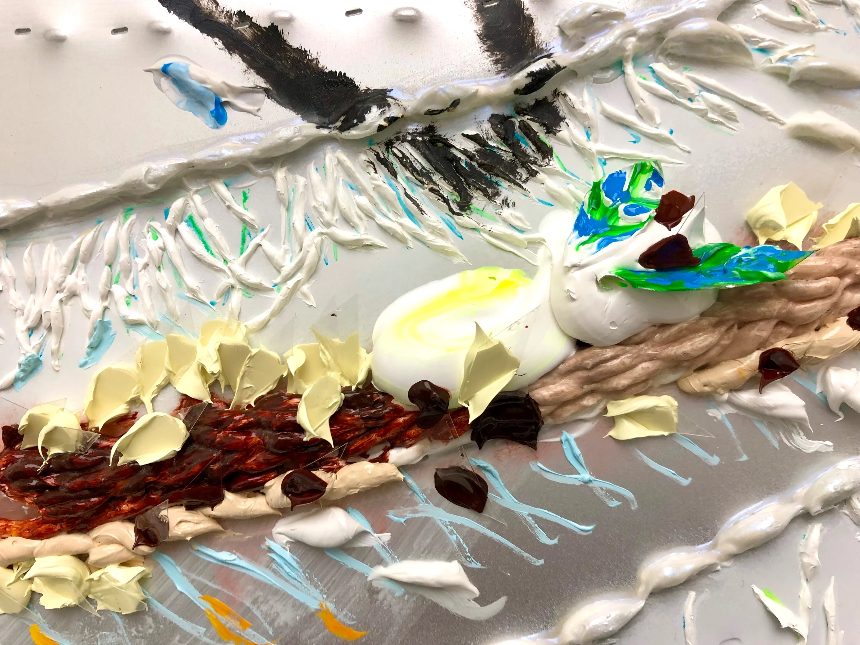 Nach dieser zweiten Art der Behandlung erfolgt erst die eigentliche Ausarbeitung. Der Grössenmassstab ist jetzt ein ganz anderer. Elza Sile geht als eine Alice im Wunderland in die Topographie der Bildoberfläche hinein. Sie pflanzt hier ganze Hecken aus Bleistift-Feinminen und lässt Miniaturgebüsche wuchern, sie bemalt dort einzelne aus der Tube gekommene Farbwürste oder schmückt sie mit winzigen, ebenfalls bemalten Blättchen. Es ist gegenüber Nathalie Du Pasquier ein Surrealismus ganz anderer Art, eine der Mikro-Dimension zugewandte poetische Haltung.