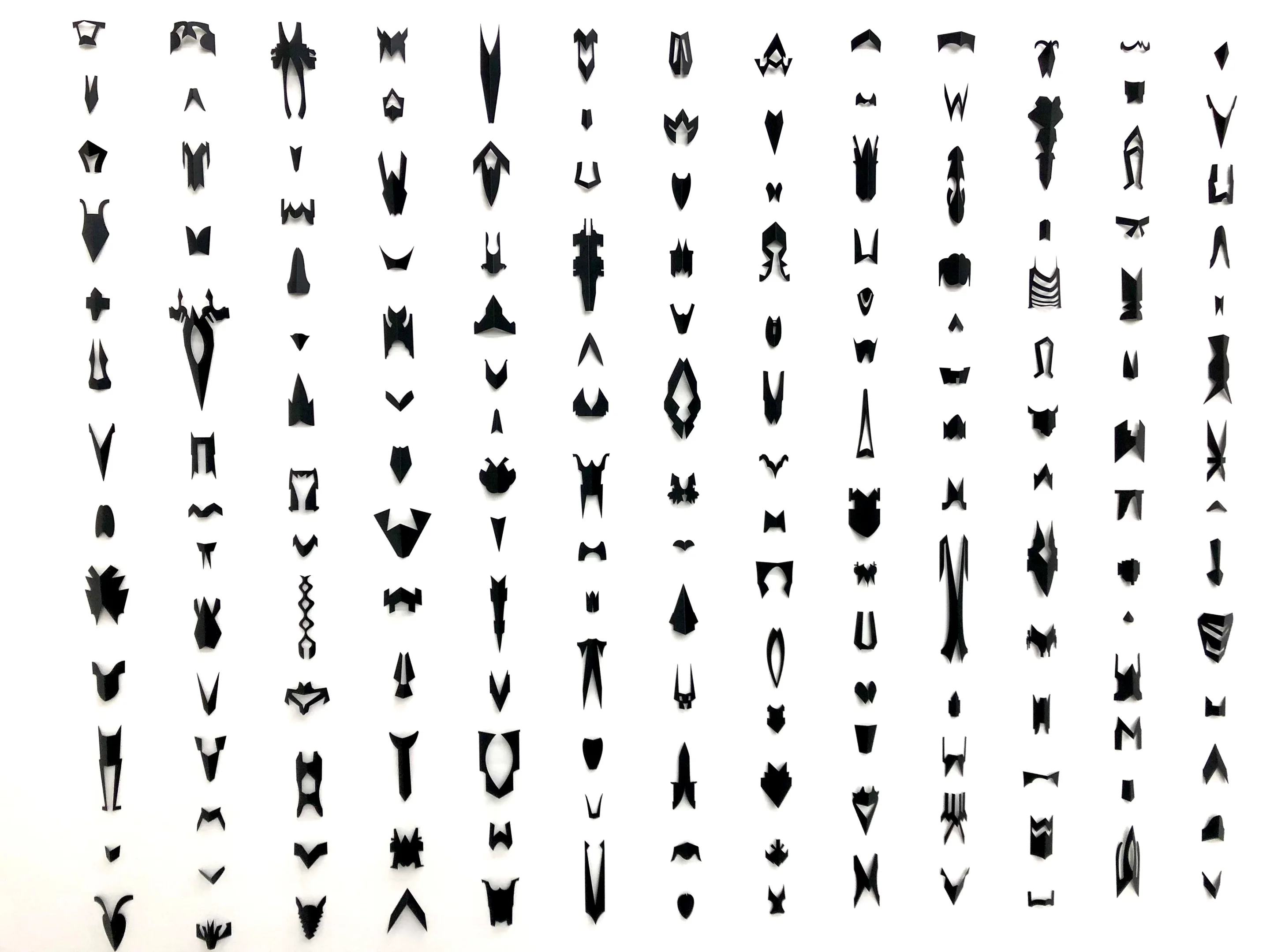 Auf den ersten Blick ganz anders erscheinen die an beiden Schmalseiten des Saales rasterförmig zu Hunderten installierten schwarzen Kleinskulpturen aus Metall. Doch auch sie sind an der senkrechten Mittelachse gespiegelte Objekte. Wie Zeichen einer unbekannten Schrift fordern sie zum Entziffern auf. Nasseri nennt sie sinnigerweise «The Order of Everything», da ein Alphabet ja in der Lage ist, buchstäblich alles zu benennen und festzuhalten.