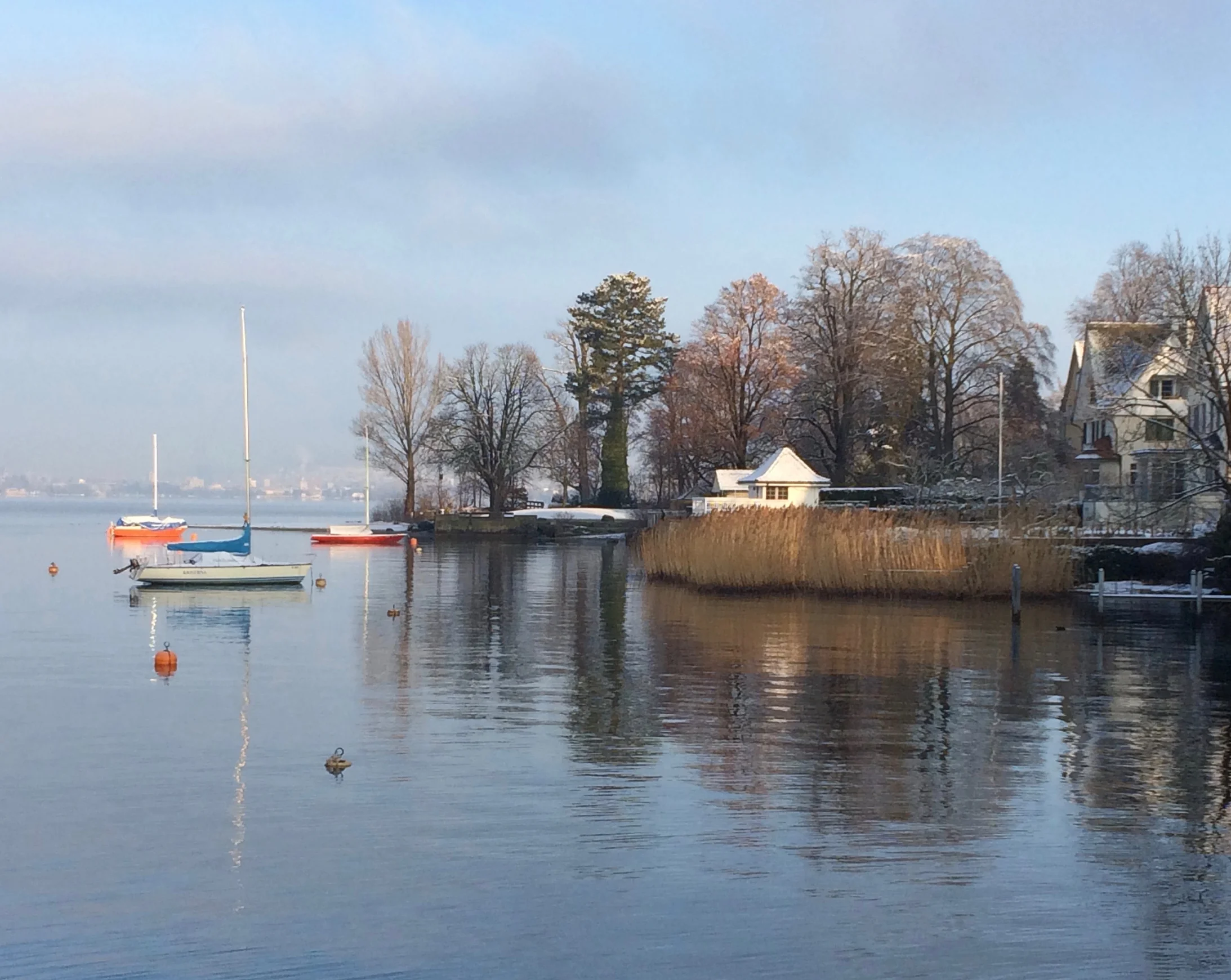 Ich schwimme an der roten Boje des blauen Seglers vorbei dem Ufer zu und bin erneut erstaunt, wie nahe man sein muss, bis die Füsse Grund finden, wo mich nicht Kant, sondern kantige Steine erwarten. Ich trockne mich ab, ziehe mein T-Shirt über und gehe auf dem Holzsteg zur kleinen Bootswerft, deren Chef bereits die Blumen gegossen hat und jetzt in der offenen Halle an einem Boot hantiert. Wenn ich die Seestrasse überquere, müssen die Banker von der Goldküste auf dem Weg zur Arbeit in ihren schwarzen Limousinen und Sportwagen für den tropfnassen Pensionär kurz anhalten. Einige nicken freundlich, wenn ich ihnen mit einem Handzeichen danke (Kant besiegt Darwin), andere drücken entnervt aufs Gas, bevor ich das andere Trottoir erreicht habe. Jetzt freue ich mich auf die Dusche, das Morgenessen mit meiner Frau und die Aussicht, morgen die Geschichte der Menschheit wiederum ganz neu denken zu dürfen.