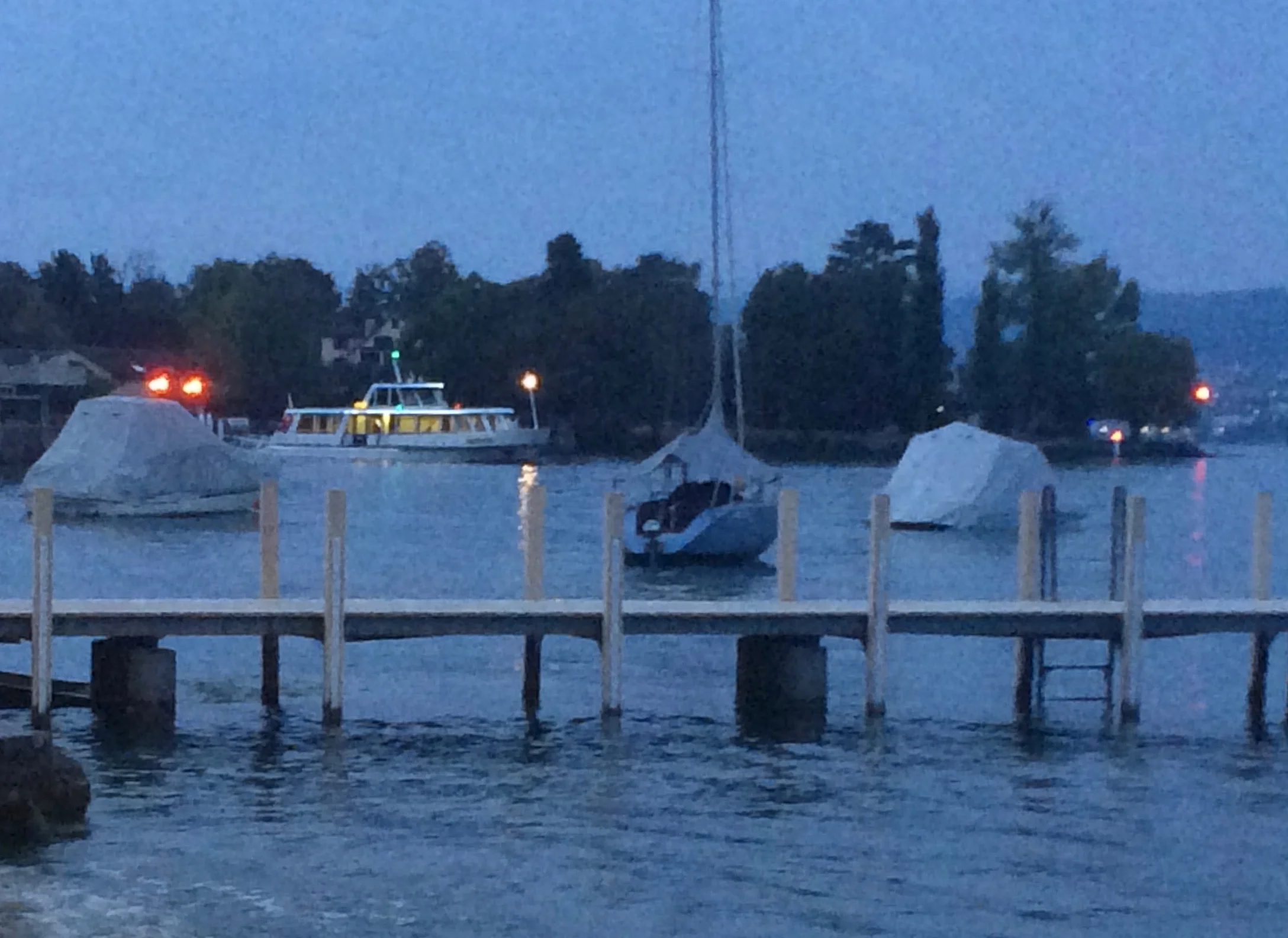 Meine Gedanken werden jäh vom Himmel geholt: Vom nahen Schiffssteg legt das Frühschiff nach Thalwil ab. In einem grossen Bogen dreht es in den See hinaus. Sein Heck kommt bei diesem Manöver dem Ufer gefährlich nahe. Um nicht in seine Bahn zu geraten, schwimme ich rasch in die kleine Nische zwischen dem Gebäude der Seeretter und der Hafenmauer, wo für die Wasserung von Schiffen eine Rampe in den See hinausführt. Hier verharre ich einige Minuten, bis sich die Wellen des auslaufenden Schiffes zwischen den Mauern ausgetobt haben.