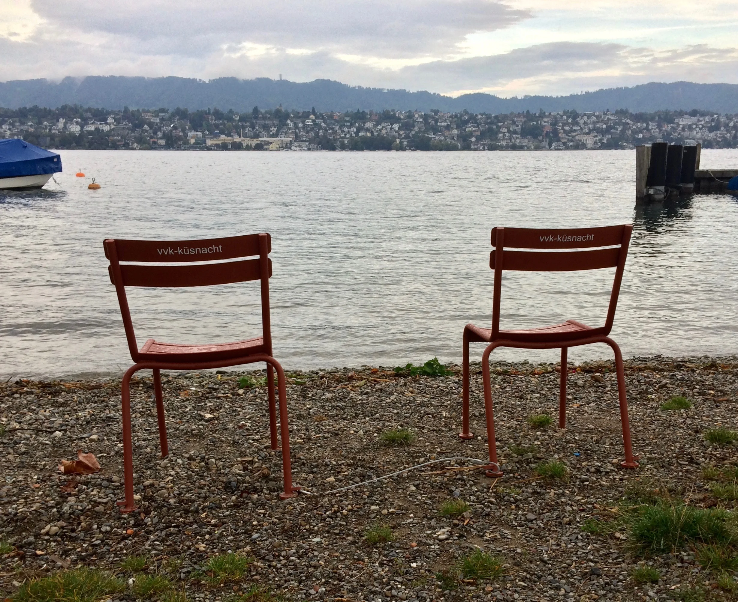 Auf dem Rückweg helfen dem Rückenschwimmer beim Navigieren der mächtige Kastanienbaum beim Hotel Sonne und der Fahnenmast auf der Hafenmauer, an dem ein Angestellter der Gemeinde jeden Sonntag die Küsnachter Fahne hisst. Wenn Baumspitze und Mast auf einer Linie liegen, bin ich auf dem richtigen Kurs, um ausserhalb des Bojenfeldes zu bleiben und doch nicht zu weit in den See hinaus zu geraten, wo um diese Zeit die Boote des Ruderclubs Küsnacht wie spitze Lanzen das Wasser zerschneiden, begleitet von ihrem Trainer im Motorboot, der Ruderinnen und Ruderer mit dem Megaphon zur Höchstleistung anspornt.