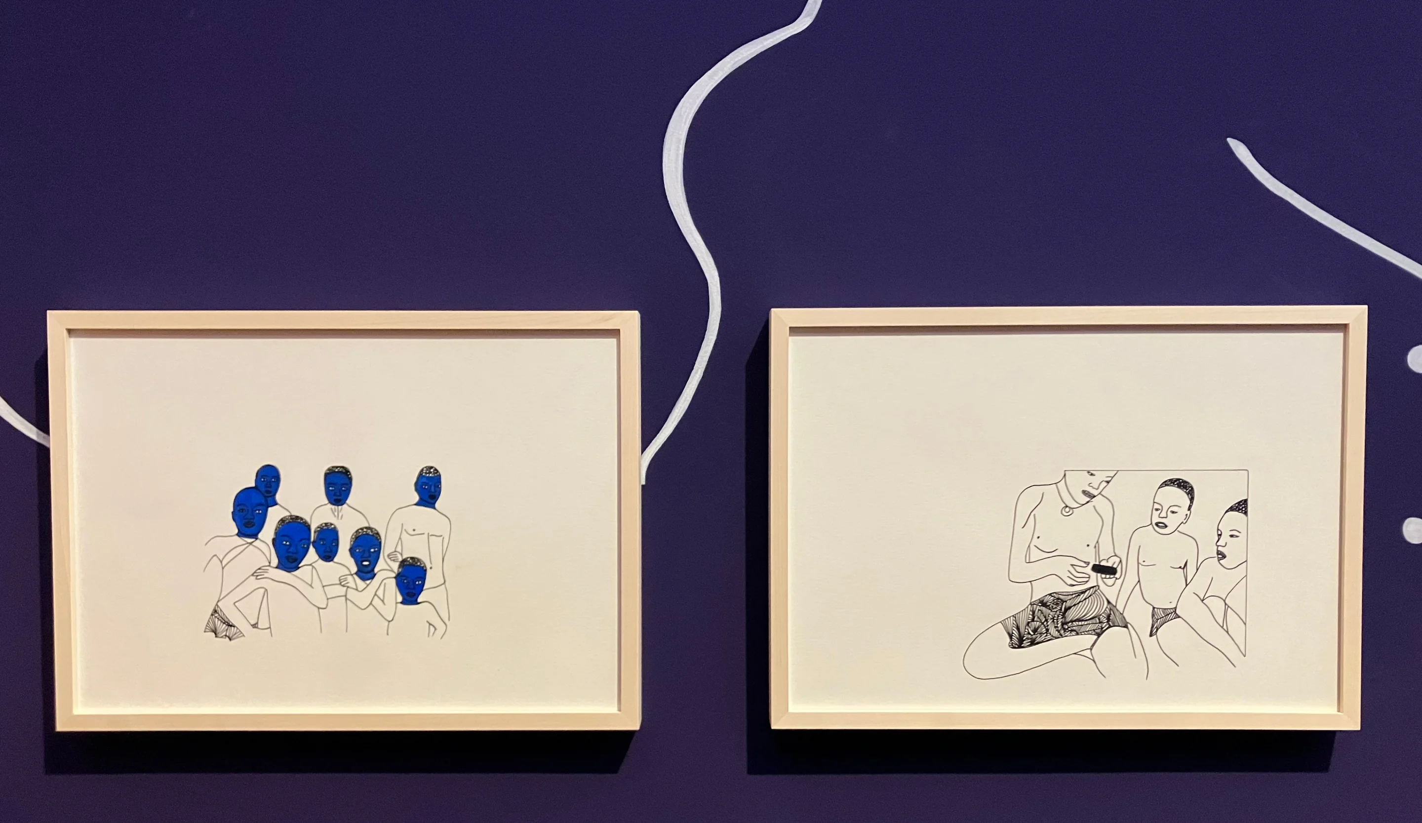 Sie durchforstete Himmelhebers Skizzen- und Fotomaterial aus dem damaligen Belgisch-Kongo (1938/39), zeichnete die Bilder nach und näherte sich so ihrem eigenen Ursprungsland an. Die wissen Linien, mit denen sie die Zeichnungen in den Räumen des Museums Rietberg verortet, zeigen die Routen von Himmelhebers Reisen im Kongo. Auch andere Künstlerinnen und Künstler schufen eigens auf die Ausstellung hin neue Werke, zum Beispiel David Shongo (*1994), der Himmelhebers Notizen und Bilder aktuellen Aufnahmen von Verkehrswegen im Kongo gegenüberstellt, oder Obou Ghais (Côte d’Ivoire, *1992), der eine Maskengestalt der Dan-Region neu interpretiert.