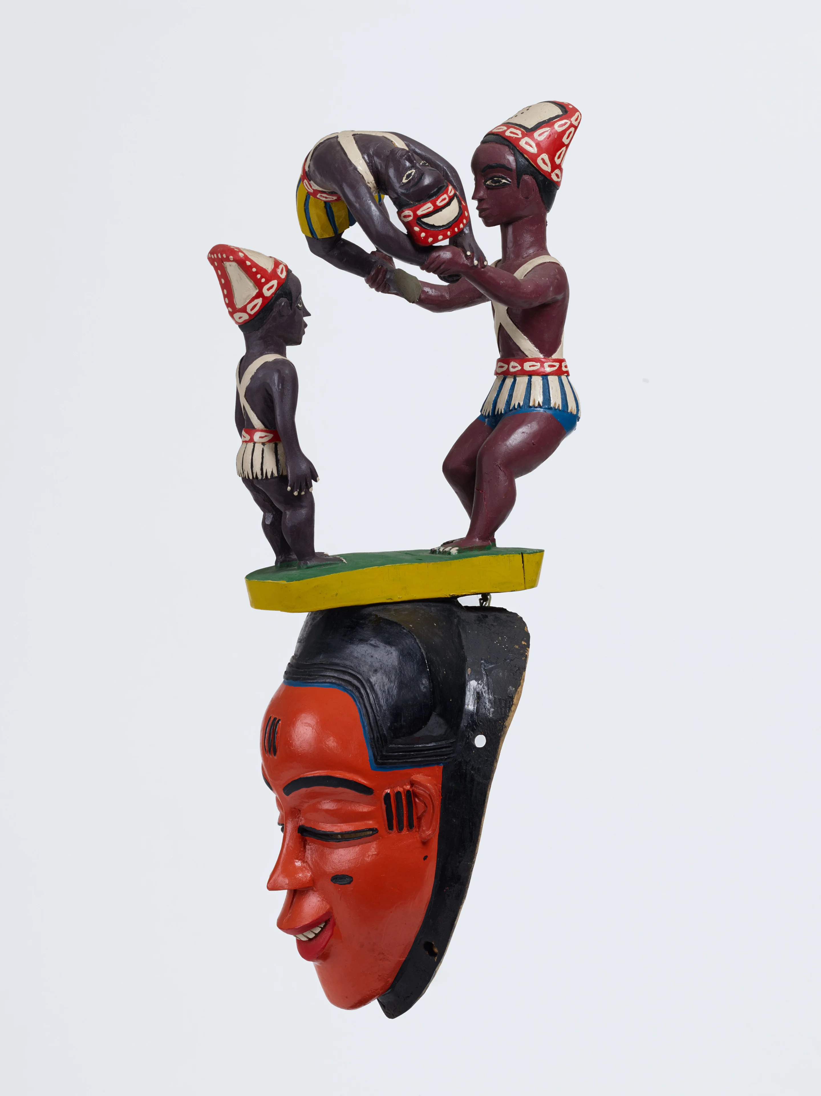 Auch Sabou bi Boti (Côte d’Ivoire, ca. 1920–2021) verdient Erwähnung als ein unverwechselbarer Künstler, der sich vom Zeitgeschehen auf lokaler und internationaler Ebene beeinflussen liess und 1975 eigens für Himmelheber und Eberhard Fischer eine bunt bemalte Maske mit einer Akrobaten-Szene herstellte.