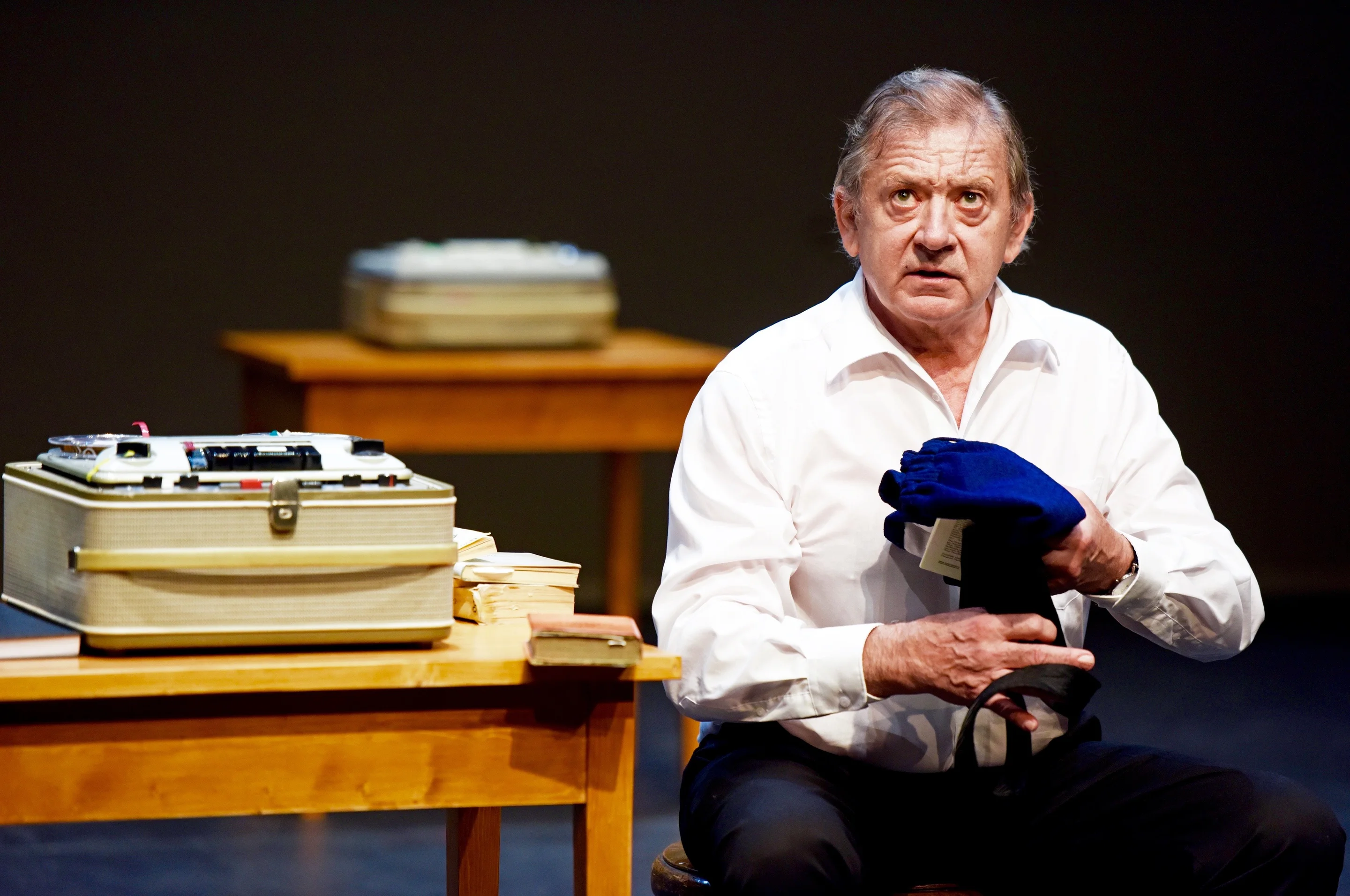 André Jung ist ganz allein auf der Bühne. Es ist eine Art Monolog, den er da spricht. «Es ist noch nicht alles ausformuliert, aber für mich ist es hochspannend und so langsam füllen sich die Sätze zu einem Bogen.» André Jung lebt in München und arbeitet vor allem in Deutschland. Jetzt für dieses Projekt mit Düggelin wieder in der Schweiz zu sein, geniesst er. «Es ist grossartig, mit Dügg zu arbeiten. Er ist jeden Tag pünktlich zur Stelle, knarzt ein bisschen rum, dann arbeitet er zwei Stunden mit mir. Er merkt alles … er sitzt da und guckt und sagt hmmmm … dann weiss ich schon, es ist Mist … und wir feilen dran. Aber ich kann nur sagen, es ist eine Wonne, mit diesem doch recht alten Urgestein auf ziemlich moderne Art Theater zu machen. Und mit ’moderner Art’ meine ich: kein Chichi und kein Video. Alles wird reduziert.» Und genau das gefällt André Jung.