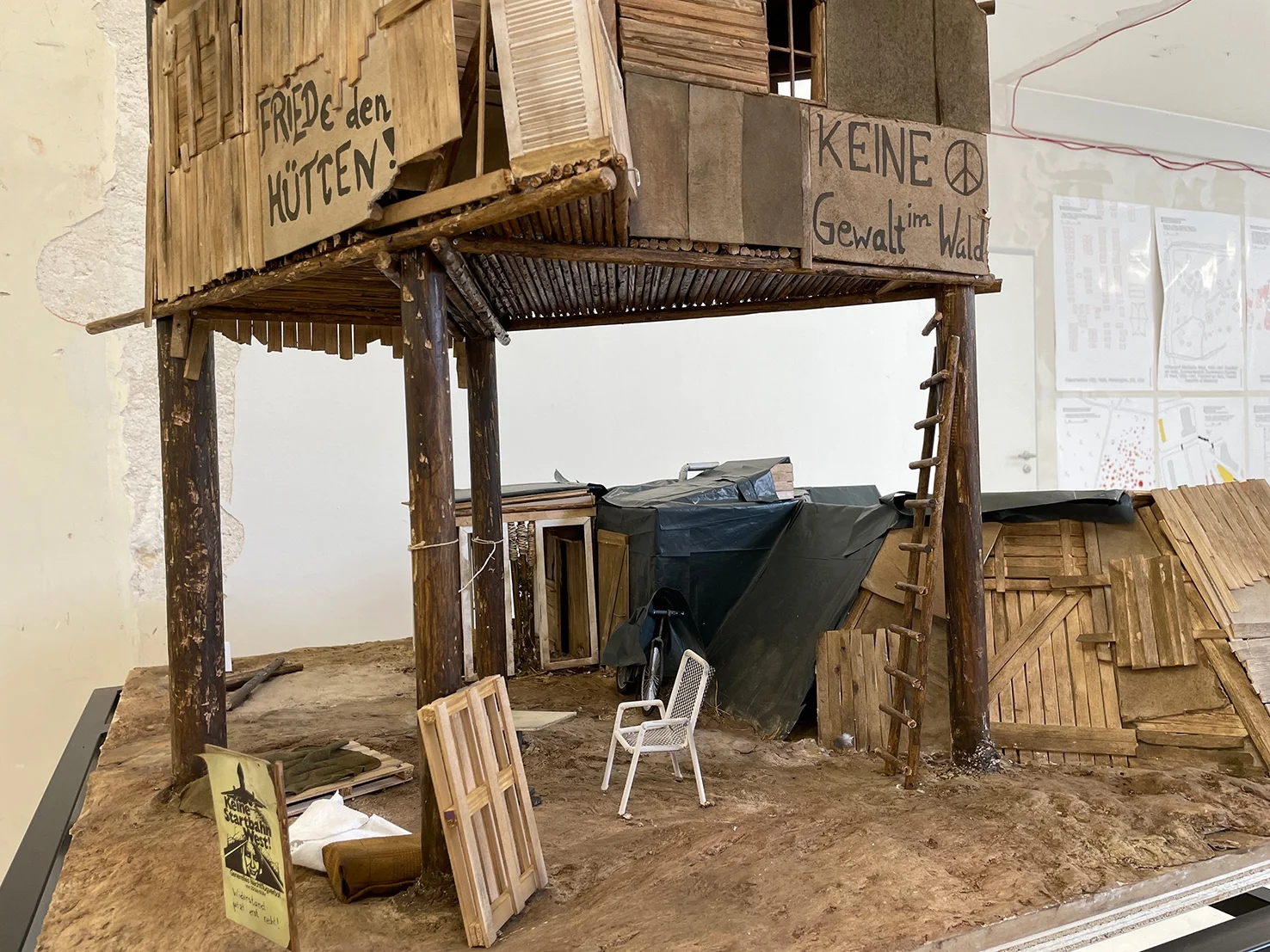Für die Ausstellung in Frankfurt wurden einige Camps als Modelle liebevoll rekonstruiert, mit allem, was dazugehörte. Damit wollte man den Besuchern die gestalterischen Kräfte, die sich in solchen Protestcamps manifestieren, bewusst machen. Zusätzlich wurden auf Plakaten wichtige Konstruktionen (Türme, spezielle Bedachungen, Küchenzelte) mit einfachen Strichzeichnungen dargestellt. Präzise Pläne zeigen, dass in der scheinbaren Unordnung der Camps so etwas wie unbeabsichtigte Stadtplanungen zu erkennen sind.