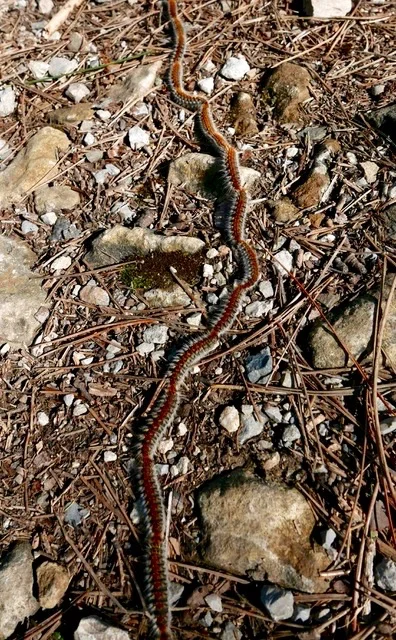 Es sind die Raupen des Prozessionsspinners, eines Nachtfalters, welcher an den Zweigen von Pinien für seine Nachkommen grosse Nester spinnt, die wie Wattekugeln aussehen. Die Körper der Raupen sind durch lange giftige Haare geschützt, welche bei Tier und Mensch schmerzhafte Verbrennungen verursachen. Wenn sie im Frühling ihre Nester verlassen und auf Futtersuche gehen, bilden sie lange Ketten und täuschen so einem potentiellen Feind eine Schlange oder ein anderes grosses Tier vor. [2]