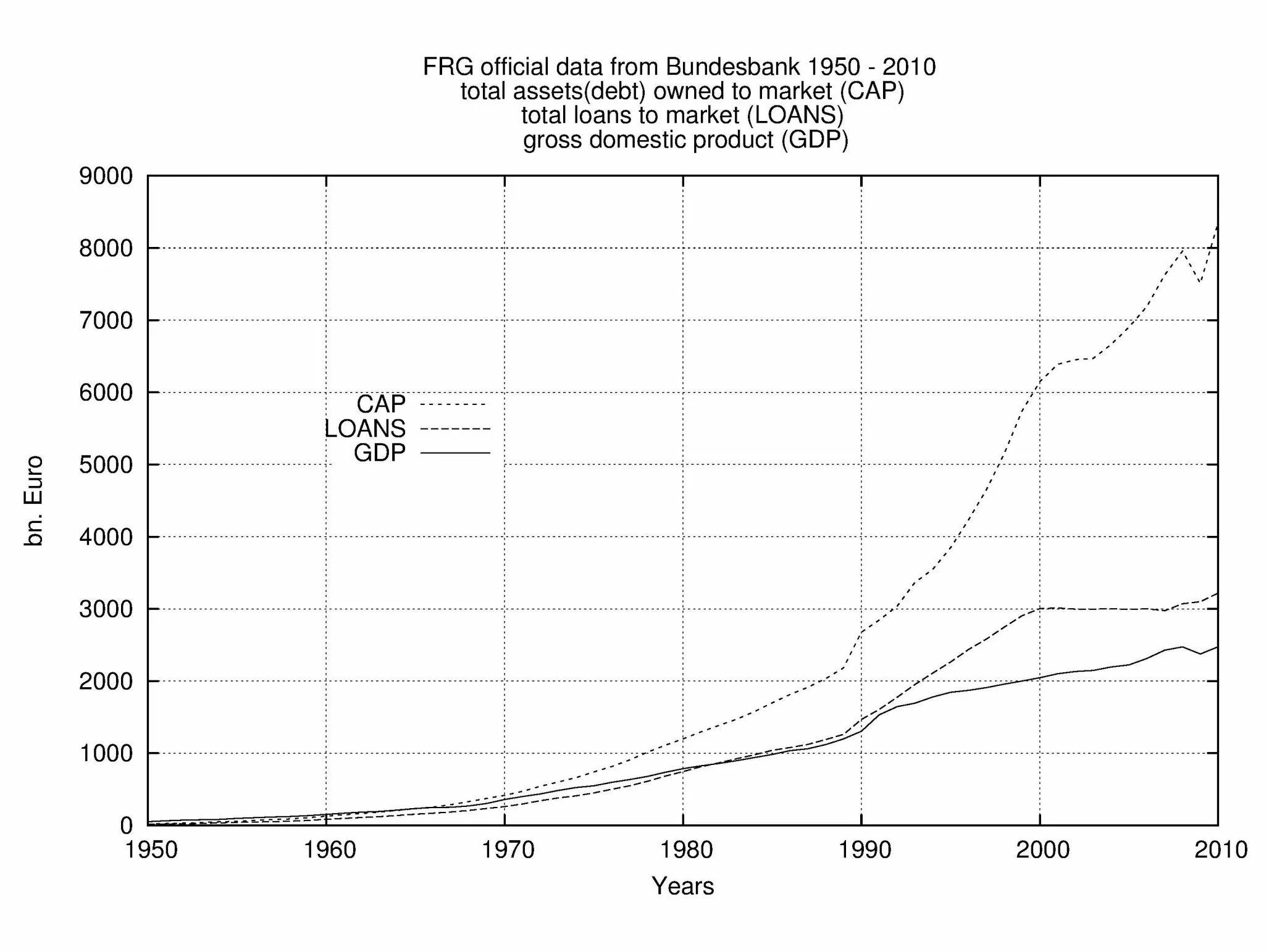 Die obigen drei Kurven sind die veröffentlichten Zahlen der Bundesbank und des Statistischen Bundesamtes für Deutschland von 1950 bis 2010. Die untere Kurve ist das BIP, die obere die Bilanzsumme aller deutschen Kreditinstitute, die mittlere Kurve die direkten Kredite davon in das BIP. Man sieht sofort, dass die Schere zwischen Vermögen (Assets, CAP) und verfügbaren BIP (GDP) mit der Zeit immer weiter auseinander klafft.
