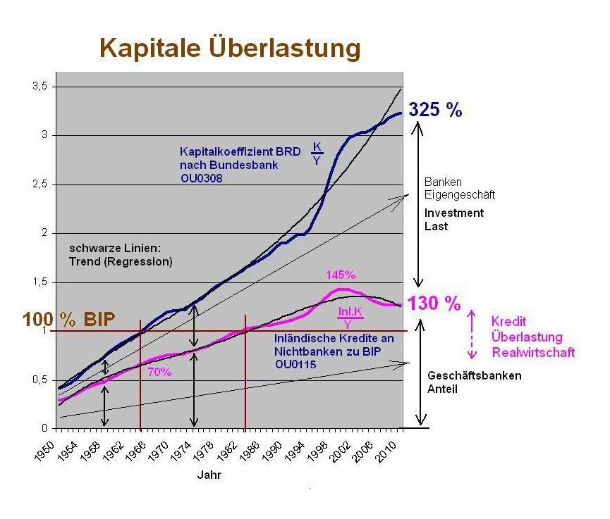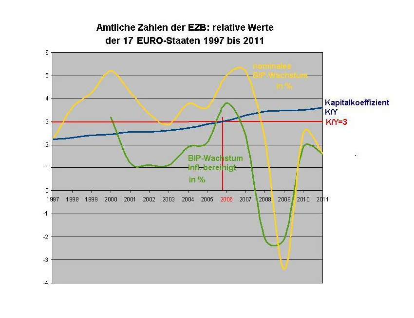 Die Situation sieht prinzipiell für alle entwickelten Nationen des Westens, mehr als 60 Jahre nach Kriegsende, ähnlich verheerend aus. Ökonometrisch kündigen sich Finanzkrisen an, wenn der totale Kapitalkoeffizient CAP/GDP den Wert 300% überschreitet oder der Wert der Kredite ins BIP sich erstmals der Marke von 140 bis 150% nähert, oder die gesamte Bilanzsumme des Geschäftsbankenmodells unter den Wert des Bankeneigengeschäfts fällt. Dieser Zustand trat für die BRD etwa im Jahre 2001 auf. Für die Gesamtbilanz der EU-17 Staaten sieht es seit 2006 auch nicht mehr besser aus, wie die nachfolgende Graphik zeigt.