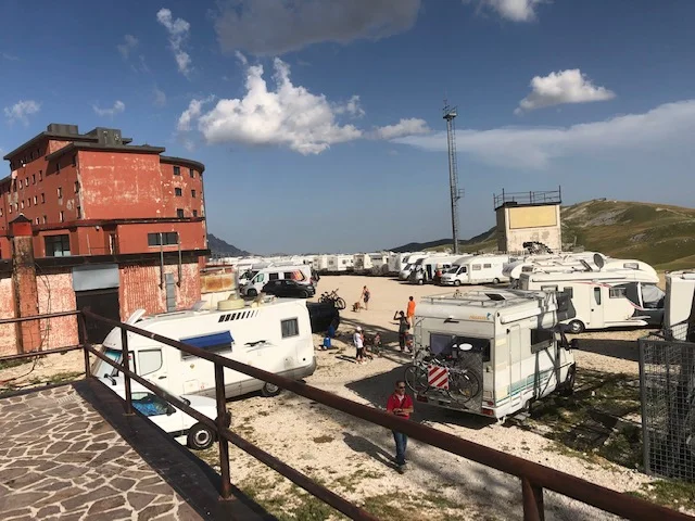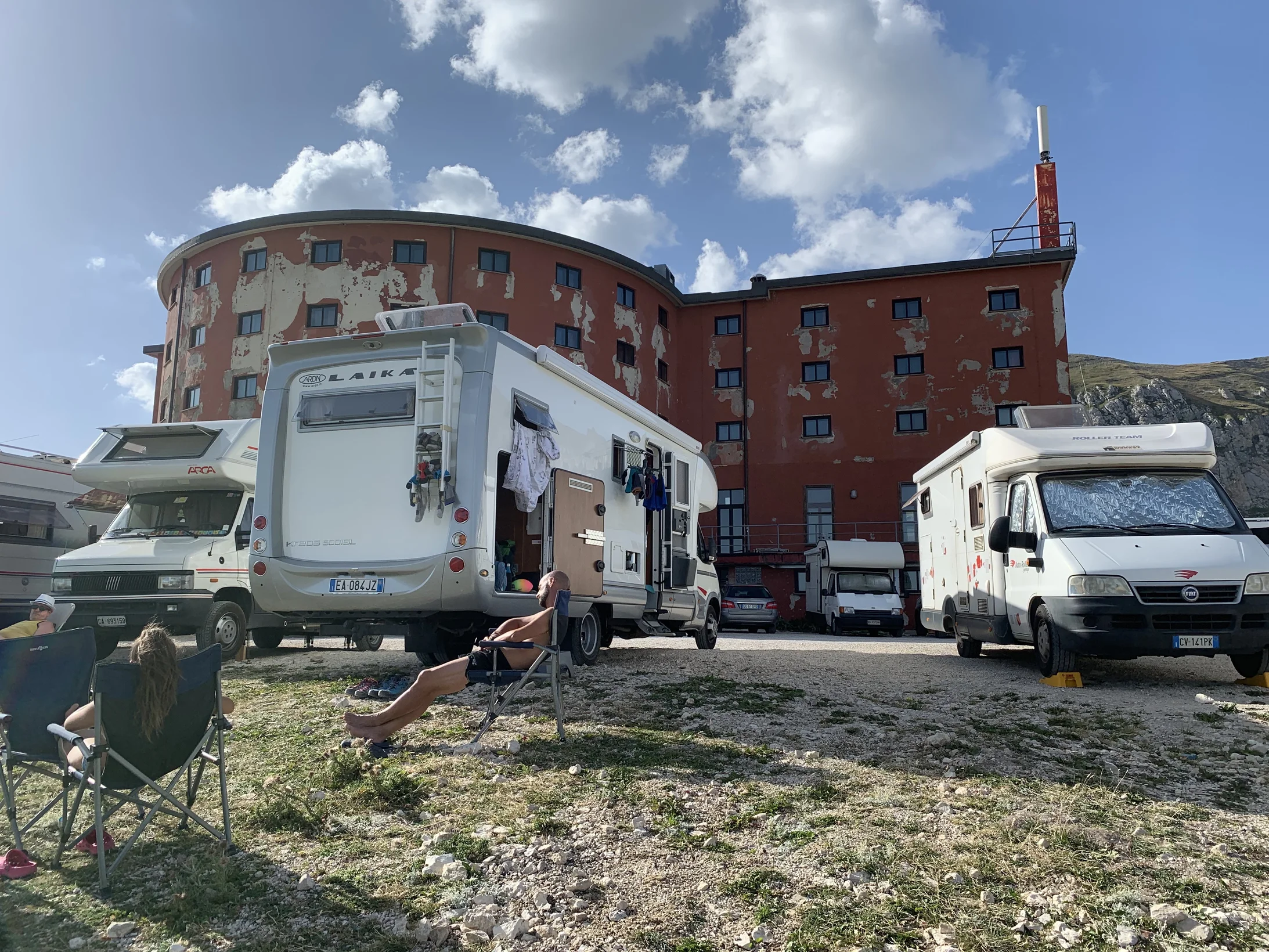 Die meisten Menschen, die sich rund um das Hotel tummeln, kommen nicht wegen Mussolini. Die Besitzer der Wohnmobile, die sich vor dem Albergo drängen, liegen halbnackt auf Liegestühlen. Viele haben ihre Katzen und Hunde mitgebracht, die hier herumspazieren. Da und dort hängt Wäsche. Am Abend wird grilliert, gesungen, gefeiert und viel getrunken.
