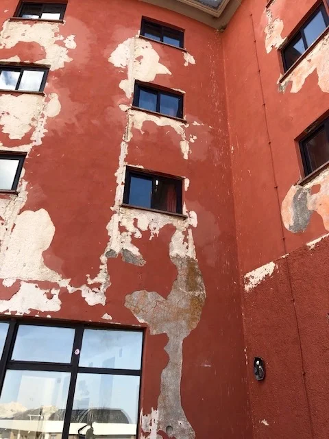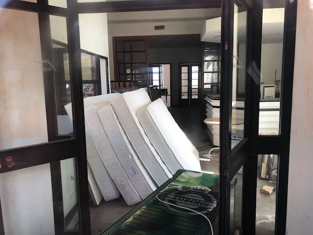 Heute ist das Hotel geschlossen. Die rote Farbe an der Fassade blättert ab. In der Eingangshalle sind neue Matratzen gestapelt.