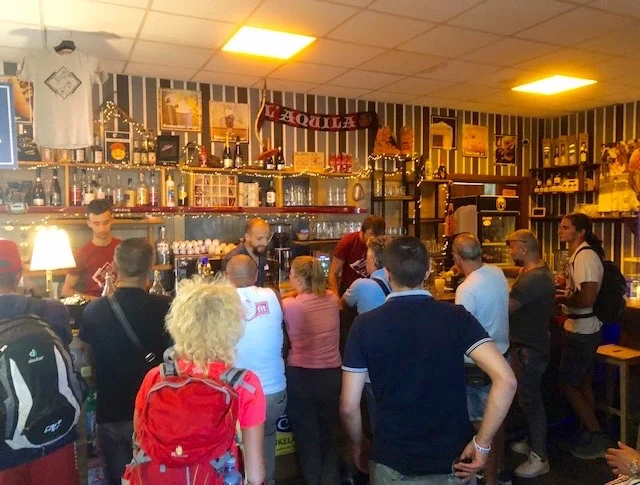 Jetzt herrscht auf dem Campo Imperatore Jahrmarktstimmung. Aus Lautsprechern plärrt lateinamerikanischer Pop. Schnitzereien, Knoblauch und Schafkäse werden verkauft, auch Linsen, die hier am Berghang wachsen. An langen Holztischen vergnügen sich Dutzende Menschen und trinken Wein und Bier, einige singen, einige grölen. Erschöpfte Bergsteiger, die vom Corno Grande zurückgekehrt sind, trocknen ihre verschwitzten Socken. An einem Stand wird „Porchetta“ verkauft, geröstetes Schwein. Die Motorradfahrer, in schwarzer Lederuniform, grüssen freundlich. Sie kommen aus Padua. Einer hat einen Totenkopf auf seinem T-Shirt.