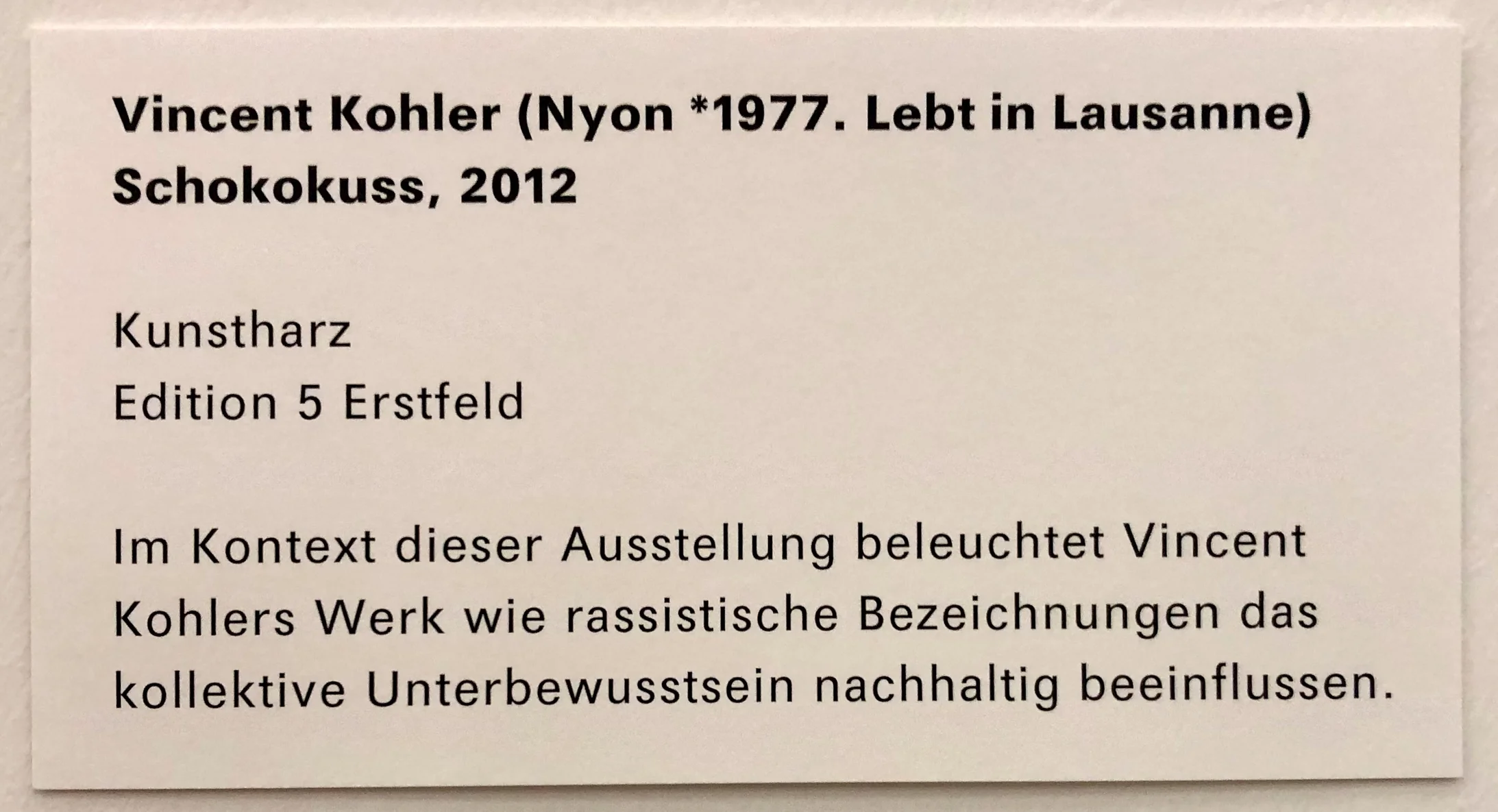 Vincent Kohlers auf monströses Format aufgeblasene Süssigkeit hat das Zeug zu einer listigen Provokation. Sie könnte der Aarauer Ausstellung zu einer Qualität verhelfen, die ihr weitgehend fehlt: sie nämlich zu einer Veranstaltung machen, die Neugier weckt, zu selbständigem Denken herausfordert und das Publikum mit Geist und Witz auf dessen allfällige rassistische Regungen hinweist.