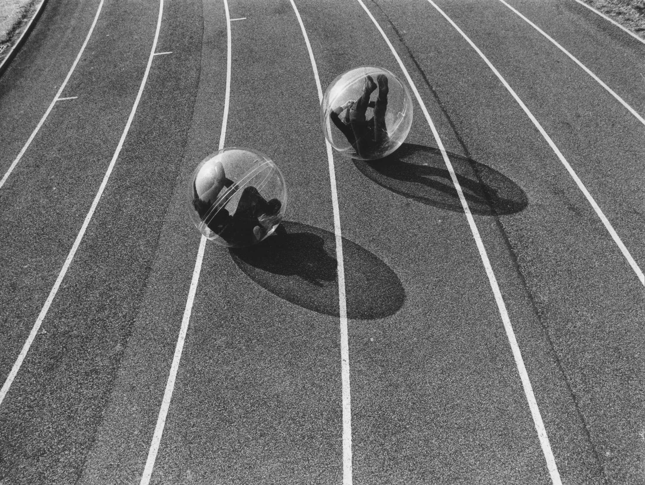Über dem Zugang zum Kunstmuseum Luzern hängt eine riesengrosse Affiche. Die Fotografie zeigt zwei transparente Kugeln. Sie werden von je einer Frauengestalt in Embryostellung ausgefüllt. Die Kugeln rollen über einen von hellen Linien durchzogenen Grund, zweifellos eine Leichtathletik-Bahn.
