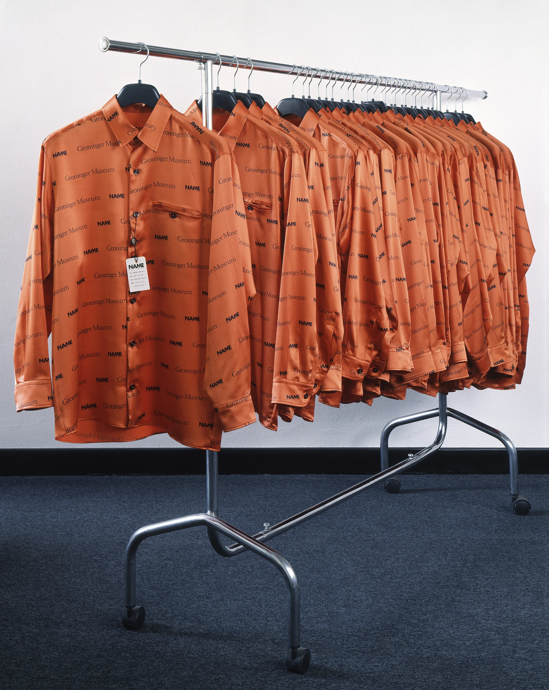 Mit einem grossen, sich über mehrere Jahre hinziehenden Konzept misst Marion Baruch in kritischem Sinne gesellschaftspolitische Räume aus und zielt an die Grenze zwischen Kunst und Kommerz: „Name Diffusion“ lautet der Name ihrer im Handelsregister eingetragenen Firma, der ein ganzer Museumsraum gewidmet ist. Ein merkwürdiger Titel, der auf den ebenso merkwürdigen oder gar absurden Umstand abzielt, dass sich in der Welt des Kommerzes sowohl Kunstwerke als auch Konsumgüter erst mit Namen oder Label als Markenzeichen etablieren und nur so einen materiellen Wert verkörpern können. Teile des Projektes wurden bereits 1992 unter dem Titel „Business Art / Art Business“ im Museum Groningen (Niederlande) realisiert. Sie sind jetzt in die Luzerner Ausstellung einbezogen. Die Künstlerin verbirgt sich hinter diesem Label. Es ist, als verwandle sie den Museumsraum in einen (fiktiven) Shop für Stoffe und Kleider – zum Beispiel für orangefarbene Hemden in allen gängigen Grössen, bedruckt mit dem Firmennamen. Der Raum ist ein Ort des ironischen Spielens der Künstlerin mit sich selbst, aber auch mit den ebenso verschiedenen wie ähnlichen wirtschaftlichen Systemen hüben und drüben.