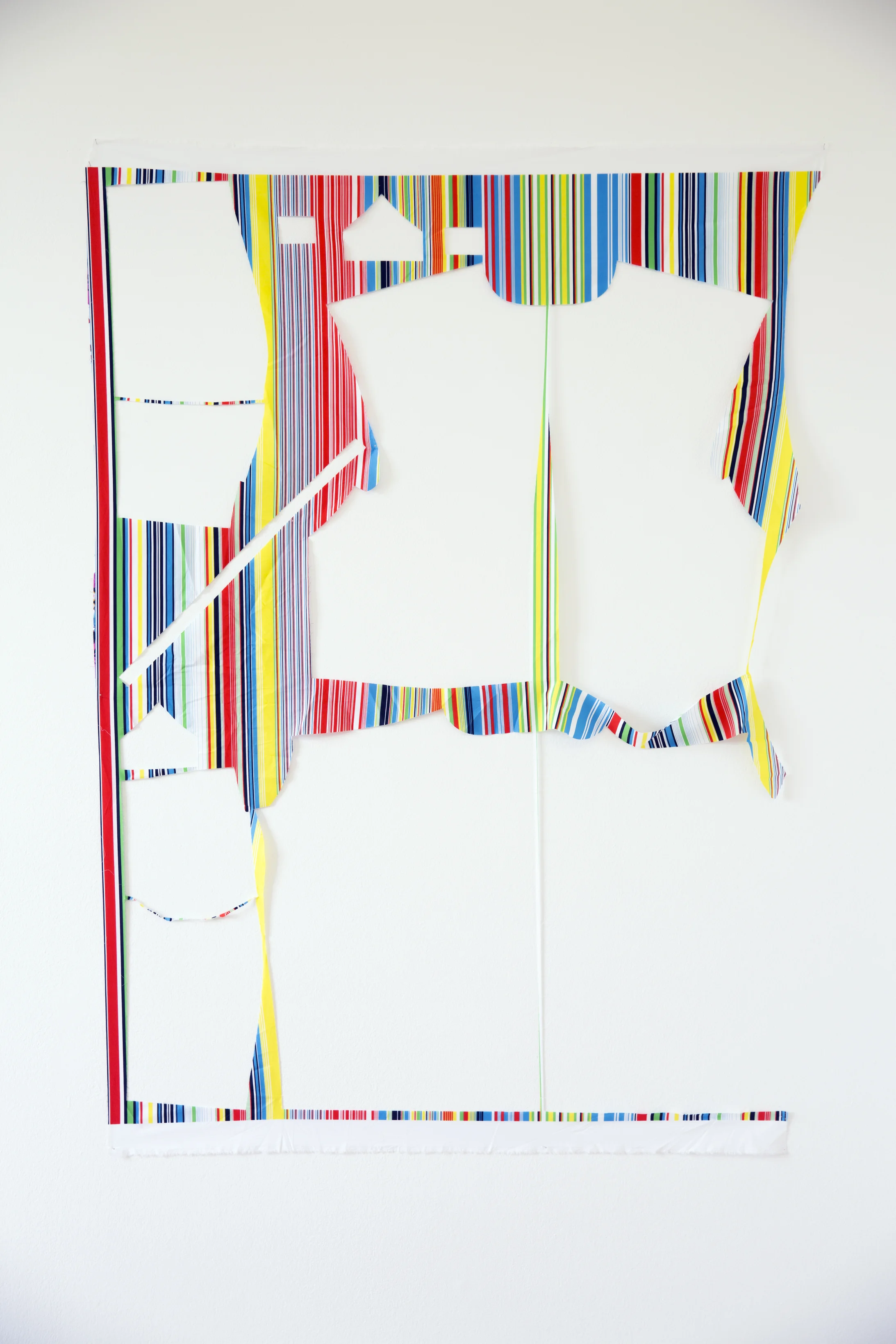 Marion Baruch arbeitet mit Textilwerkstätten zusammen – oder besser gesagt: Die Stoffe, die sie verwendet, stammen aus bekannten Modeateliers der Lombardei. Es sind Stoffresten, die zurückbleiben, wenn die für die Kleidungsstücke benötigten Teile aus dem Design-Stoff herausgeschnitten wurden. Marion Baruch arbeitet mit den übrig gebliebenen schmalen Stoffstreifen, in die sie nirgendwo mit der Schere eingreift. Sie arbeitet mit den Rändern, also mit scheinbar Wertlosem. Das lässt uns nach dem Wert dieses Wertlosen fragen, mag uns aber auch an den Menschen denken lassen, der den unserer Wahrnehmung entzogenen Stoff als Kleidungsstück trägt. Das filigrane Kunstobjekt an der Museumswand lenkt unsere Aufmerksamkeit weit über die Grenzen der Institution Kunst hinaus in gesellschaftlich-soziale Bereiche.