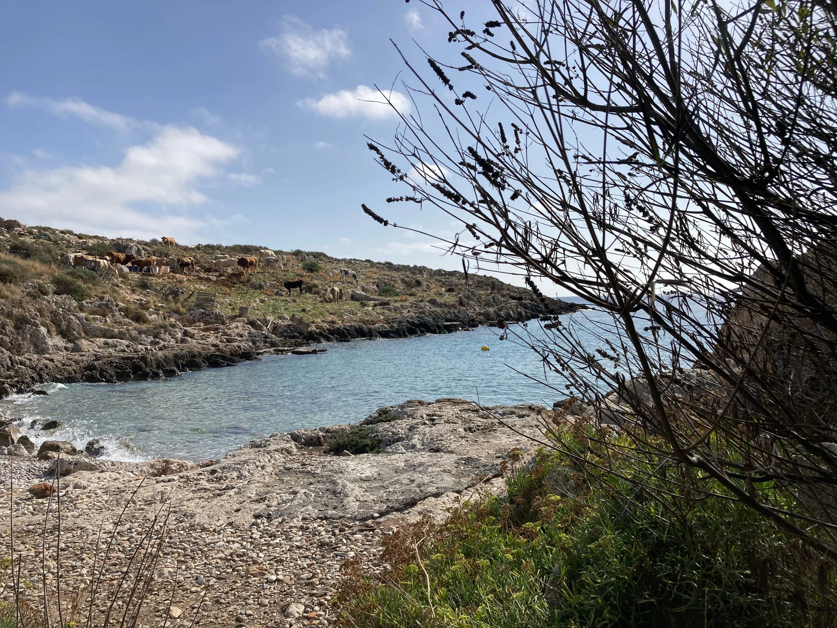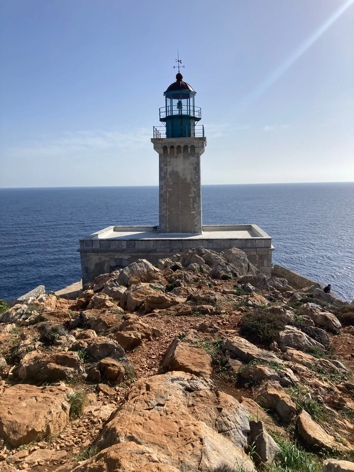Auf einem felsigen Pfad wanderten wir auf der immer schmäler werdenden Landzunge bis zur äussersten Spitze von Lakonien, wo ein Leuchtturm steht, dessen umgebende Mauern bereits teilweise ins Meer abgerutscht sind. – Auch hier die über alles triumphierende Zeit! – Es soll, neben Gibraltar, der südlichste Punkt des europäischen Festlandes sein. Zwei Frachtschiffe suchen sich ihre Route zwischen dem Kap und der weiter südlich liegenden Insel Kithira. Hier muss Odysseus nach der Zerstörung von Troja vorbeigesegelt sein, nicht ahnend, dass seine Heimreise zehn Jahre dauern würde.