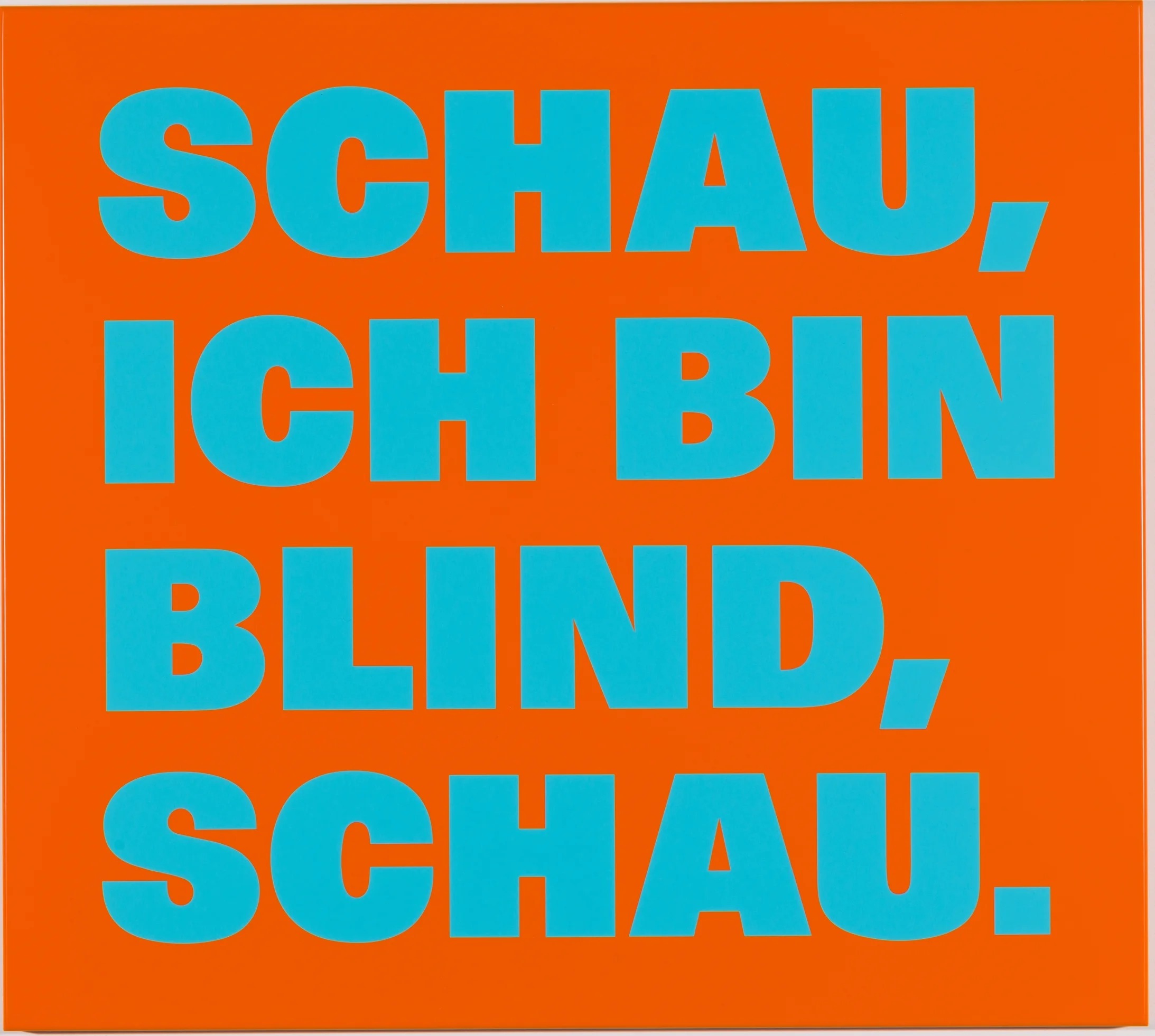 Als Beispiel für Zauggs Vorgehen dient die Serie „Schau, ich bin blind, schau“ von 1997/1998. Sechs der Tafeln (Aluminium, gespritzter Lack, Siebdruck) gehören zur Schenkung. Sie alle zeigen, in halbfetten Versal-Buchstaben in Adrian Frutigers Univers-Schrift, den gleichen irritierenden Text mit dem Antagonismus „blind – schau“ und mit dem bewussten Verschleiern der Grenze zwischen Bild und Betrachter: Wer ist „ich“? Das Bild? Wer fordert wen auf, zu schauen? Irritierend sind ebenso die Farbkontraste zwischen Buchstaben und Hintergrund. Die Kontraste gehorchen keinem System, aber in ihrer Härte schmerzen sie das Auge. Sie stören, auch wenn vom Schauen die Rede ist, unsere visuelle Wahrnehmung.
