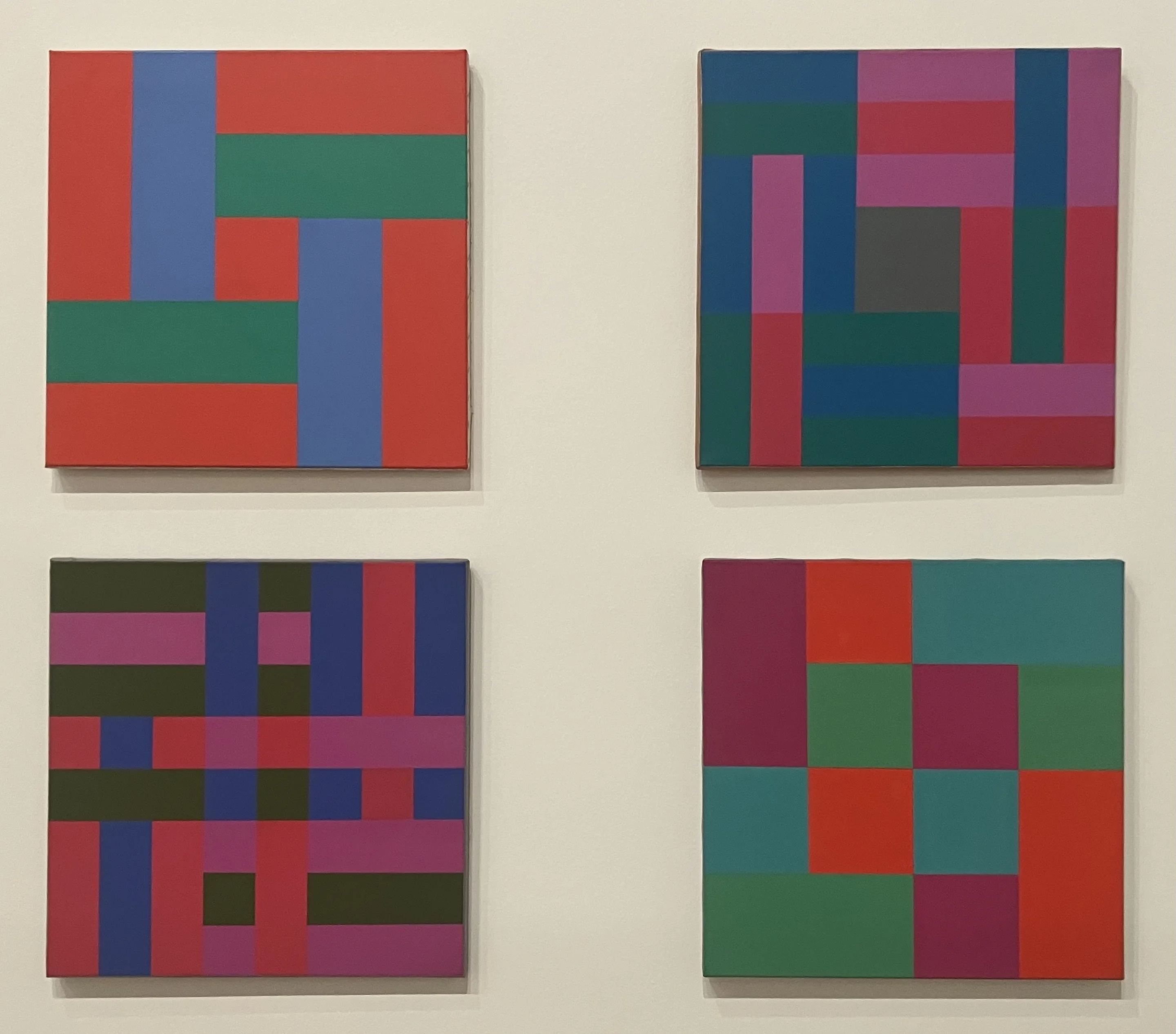 Nur Quadrate? Immer das Gleiche? Wohl wechseln die Farben, welche die Quadrate (beinahe) ohne Pinselspuren oder andere Erinnerungen an einen Auftrag auf die Fläche monochrom bedecken. Sie wechseln von Gelb zu hellem Grün, von hellem Gelb über Orange, verschiedene Rot-Abstufungen, Violett, Dunkel- und Hellblau bis zu hellem Grün und schliesslich Gelb. Es gibt aber nie eine frei in die Fläche gesetzte Linie als Trennung zwischen den Farbtönen. Es gibt keine Diagonalen, sondern ausschliesslich rechte Winkel und Waagrechte und Senkrechte, und es gibt nie ein Dreieck oder gar einen Kreis. Immer das Gleiche also, wenn auch in wechselnden satten und leuchtenden Farben.