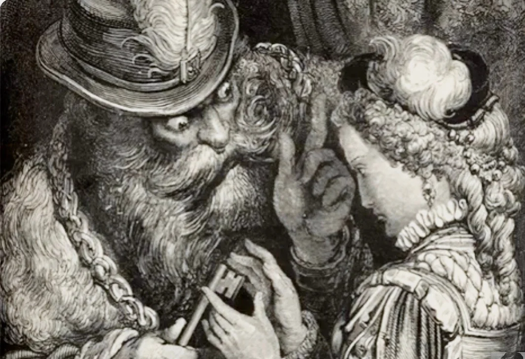 Blaubart ist das märchenhafte Motiv eines mittelalterlichen Ritters, der in seinem Schloss Frauen hinter Schloss und Riegel hält, weil diese ihm ungehorsam sind oder aber, von unbezwingbarer Neugierde für Juwelen, in eine vom Mann gestellte Falle tappen.