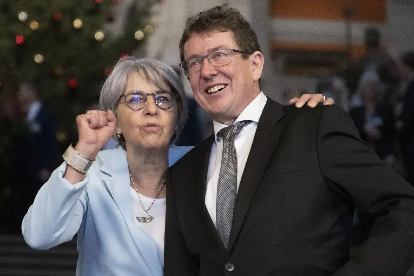 Der Friedensnobelpreis 2022 geht an die Menschenrechtsorganisation «International Memorial Board», den belarussischen Menschenrechtler und Dissidenten Ales Bialiatski und an die ukrainische Menschenrechtsvereinigung «Center for Civil Liberties». Das Bild zeigt die Übergabe der Medaillen am 10. Dezember. Links Natalia Pinchuk, die den Preis für ihren inhaftierten Mann Ales Bialiatski entgegennahm. In der Mitte Yan Rachinsky, der Leiter von Memorial, und rechts Oleksandra Matviychuk, Präsidentin der ukrainischen Menschenrechtsvereinigung «Center for Civil Liberties». (Foto: KeystoneAP/Markus Schreiber)