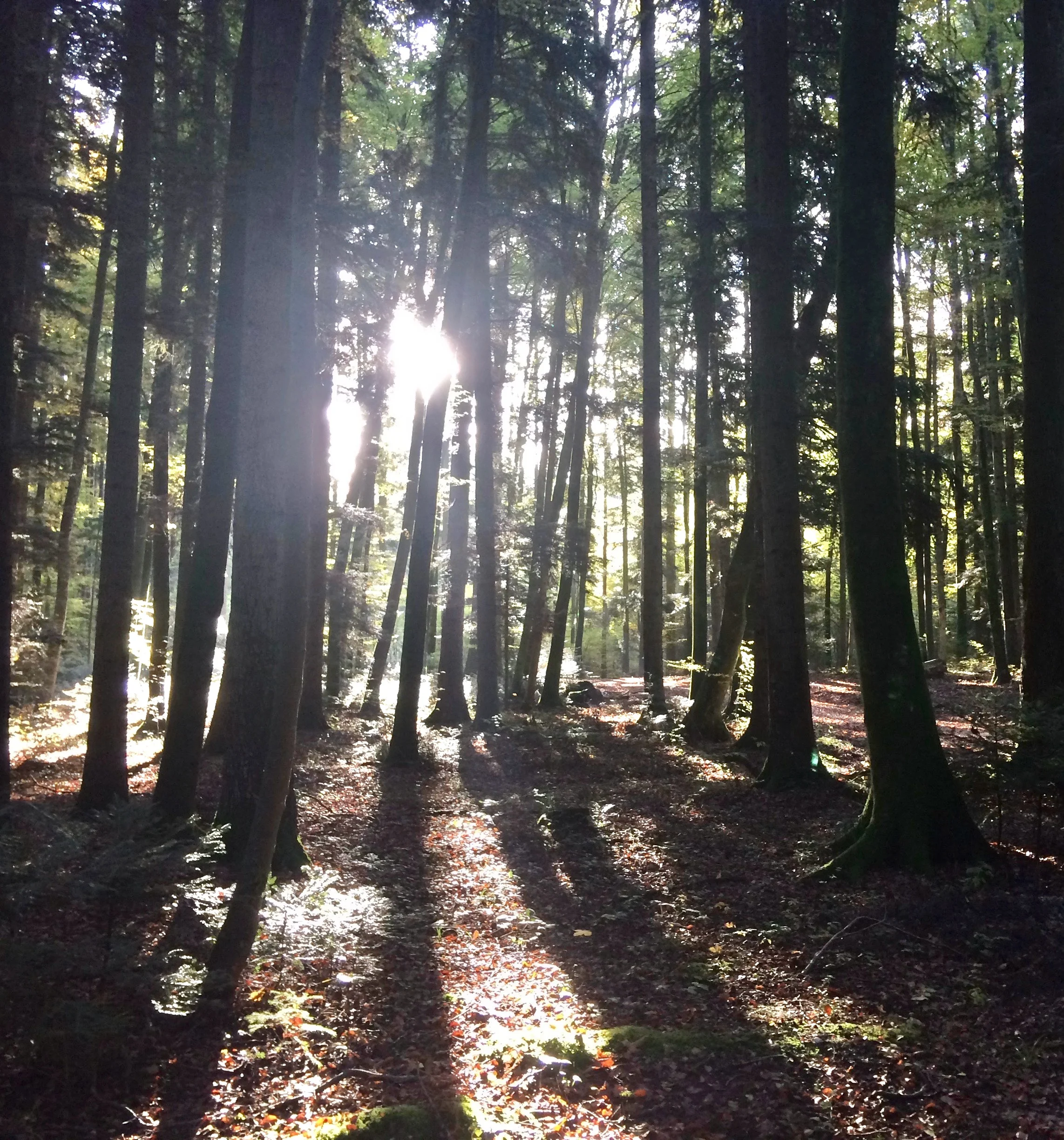 Hans und ich schlagen die entgegengesetzte Richtung ein, wandern südwärts, zuerst auf einer geteerten Quartierstrasse an Einfamilienhäusern vorbei, welche so gar nicht zu meinen Jugenderinnerungen an das verschlafene Bauerndorf auf dem Gempenplateau passen wollen. Später führt uns der Weg durch einen lichten Wald, in den die flachen Strahlen der Herbstsonne einfallen.