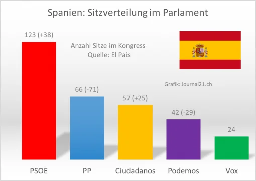 Bei den Parlamentswahlen in Spanien werden die Sozialisten stärkste Partei. Die PSOE von Ministerpräsident Pedro Sánchez kommt auf 28,7% der Stimmen (+6,1%). Die Partei verfügt jetzt im Congreso de los Diputados über 123 der 350 Sitze (+38).