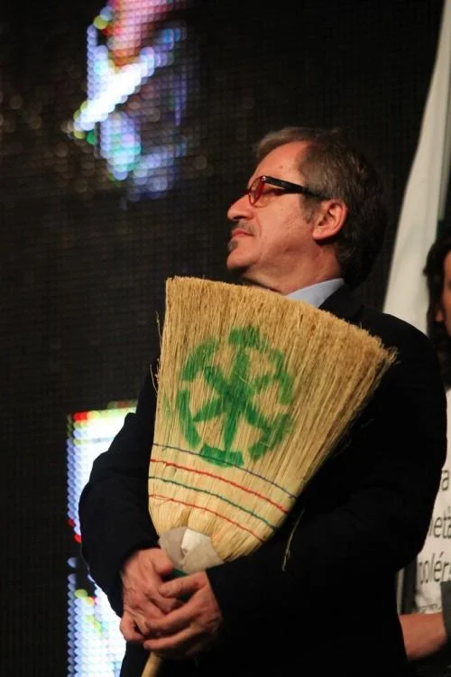 La pulizia “padana” è arrivata fin sul palco della manifestazione. In una foto che l’indomani compariva su alcuni quotidiani, Roberto Maroni impugna con la destra una scopa rivolta verso l’alto; porta impresso il Sole delle Alpi, simbolo leghista per eccellenza, segno che si tratta di un’operazione tutt’altro che improvvisata. Non è una qualsiasi ramazza di plastica, ma di saggina, insomma la scopa per definizione; porta con sé quel tanto di domestico e popolare che si accorda perfettamente con l’immagine che da decenni propone di sé la Lega. In questo senso è una vera e propria insegna. Eppure il senso purificatore che le si voleva attribuire non riesce a nascondere il tono aggressivo che da secoli scope e ramazze si portano dietro: attaccare gli avversari. Proprio lì accanto c’è l’antagonista da “spazzar via”, Bossi appunto. Non è un caso, del resto che molti commentatori abbiano letto la manifestazione leghista come una vera e propria intronizzazione di Maroni.