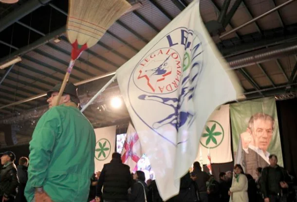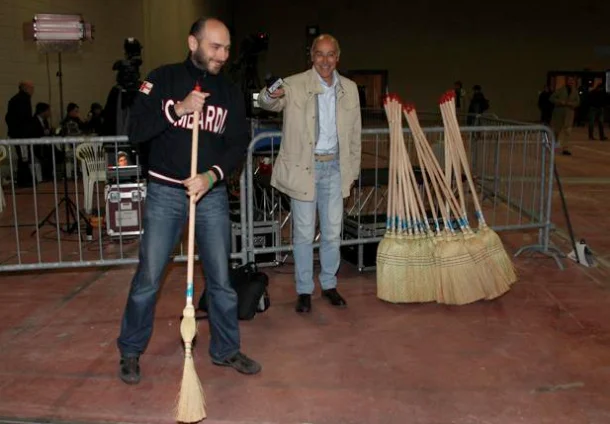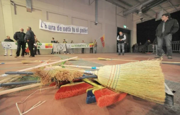 Dunque, la retorica della pulizia e la simbologia della scopa sembrano funzionare ancora. E infatti nella manifestazione leghista del 10 aprile alla Fiera di Bergamo molti militanti hanno seguito l’invito del partito: alcuni di essi issano le scope, altri camminano appoggiandole alle spalle; alcuni dirigenti si fanno fotografare mentre scopano per terra con aria divertita; altri si mettono in posa con una t-shirt su cui è disegnata una ramazza con la scritta “L’è ura de netar fò ol polér”, la stessa che compare su uno striscione.