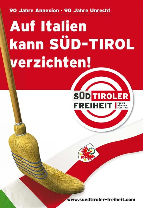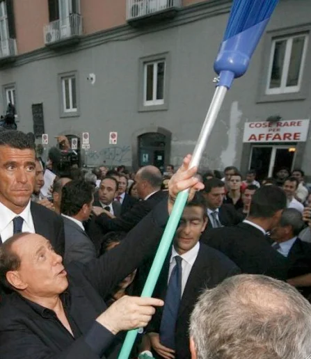 Gli esempi potrebbero continuare. Limitiamoci alla scena politica italiana. Nel 2010 la “Südtiroler Freiheit” diffuse un manifesto col motto “Il Sudtirolo può rinunciare all’Italia”: sotto lo slogan, il tricolore veniva spazzato via mentre subentrava la bandiera bianco e rossa tirolese. Un altro manifesto di partito, gli “Azzurri Italiani”, è ancora ben visibile sul web: il doppio senso è fin troppo prevedibile, come pure l’idea di spazzar “via la vecchia politica”. Poteva mancare Silvio Berlusconi? Eccolo durante la crisi dei rifiuti a Napoli mentre, attorniato da folle e guardie del corpo, armeggia con una ramazza come uno sbandieratore; la ramazza, non poteva essere altrimenti, è azzurra e di plastica.