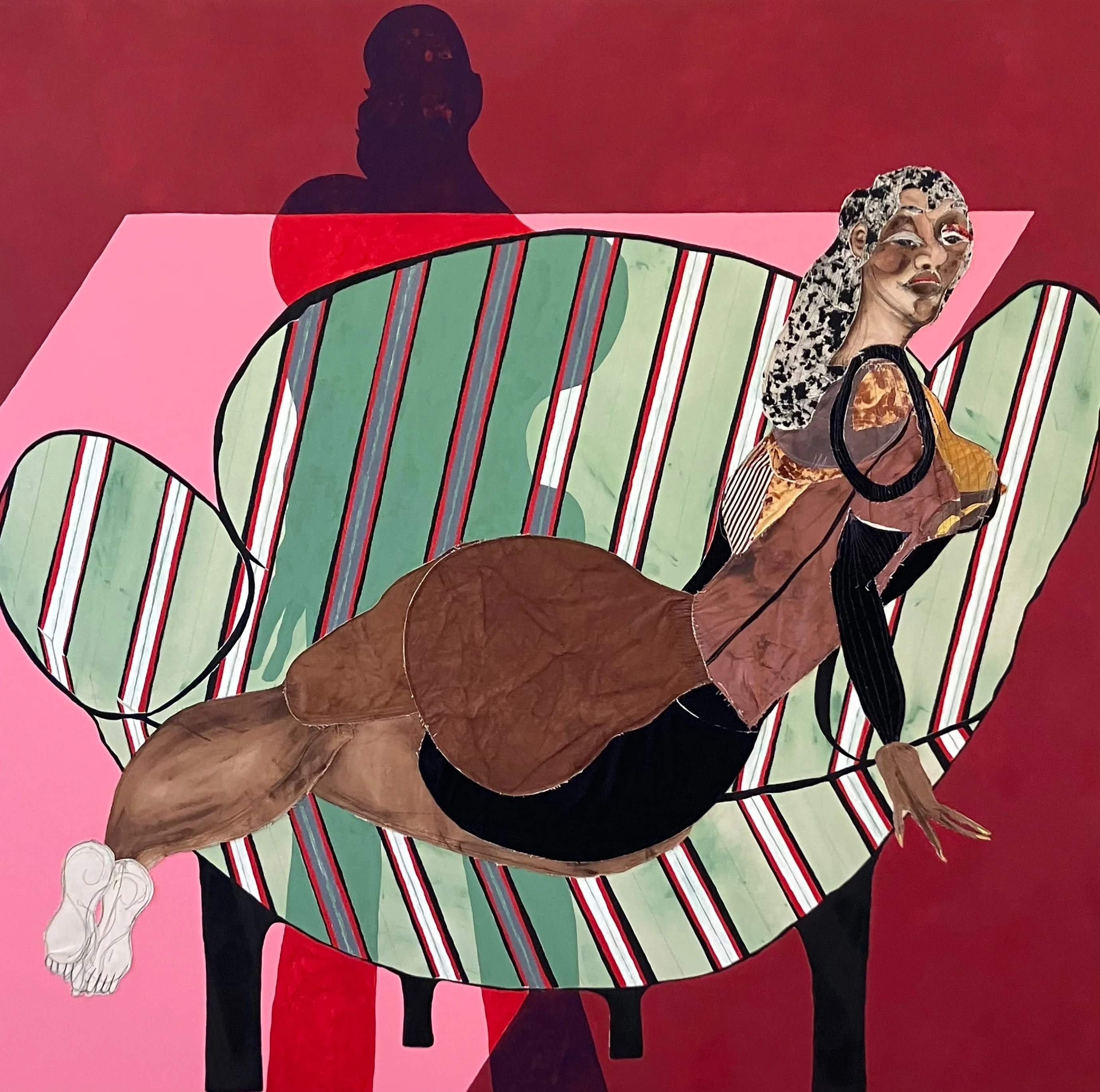 In einem anderen Raum begegnen wir dem ebenfalls grossen Werk «Candy». Abgebildet ist eine Couch, auf der eine weibliche Gestalt liegt. Sie wendet uns den Rücken zu, dreht aber den Kopf so ab, dass sie uns in die Augen blicken kann. Der schwarze Schatten einer wohl männlichen Figur begleitet sie. Tschabalala Self sagt dazu, sie habe sich von einem Werk Picassos inspirieren lassen. Die Position der Frau erinnert an Picasso. Das präzise Zitat aus einem Picasso-Bild ist aber vor allem das Streifenmuster der Couch.